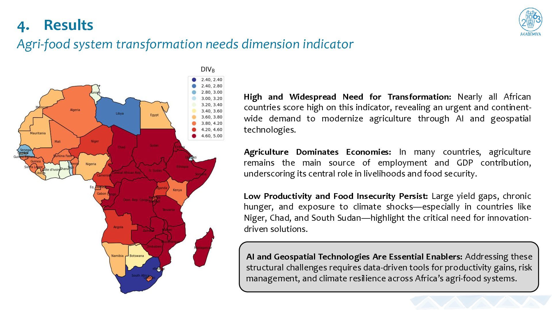 Widespread Need for Transformation: Nearly all African countries score high on this indicator, revealing an urgent and continent- wide demand to modernize agriculture through AI and geospatial technologies. Agriculture Dominates Economies: In many countries, agriculture remains the main source of employment and GDP contribution, underscoring its central role in livelihoods and food security. Low Productivity and Food Insecurity Persist: Large yield gaps, chronic hunger, and exposure to climate shocks—especially in countries like Niger, Chad, and South Sudan—highlight the critical need for innovation- driven solutions. AI and Geospatial Technologies Are Essential Enablers: Addressing these structural challenges requires data-driven tools for productivity gains, risk management, and climate resilience across Africa’s agri-food systems.