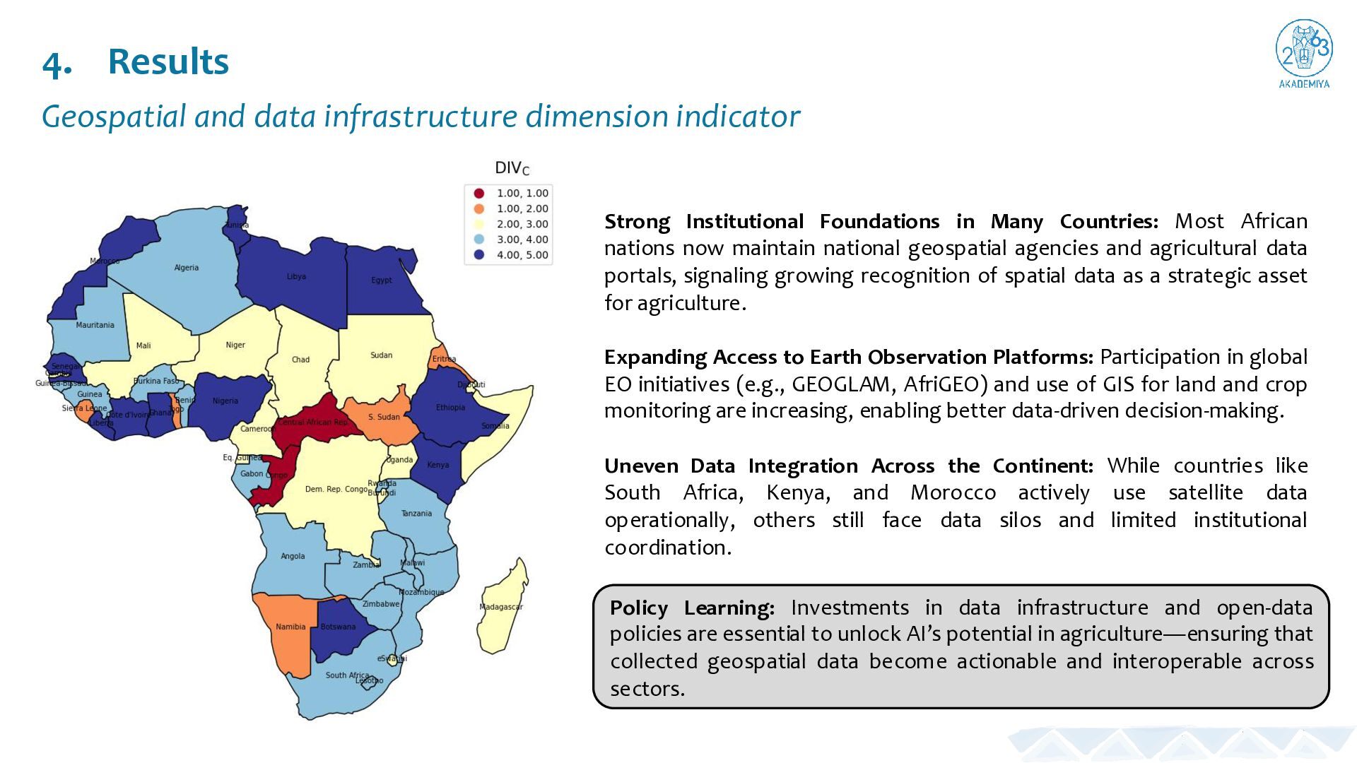 Foundations in Many Countries: Most African nations now maintain national geospatial agencies and agricultural data portals, signaling growing recognition of spatial data as a strategic asset for agriculture. Expanding Access to Earth Observation Platforms: Participation in global EO initiatives (e.g., GEOGLAM, AfriGEO) and use of GIS for land and crop monitoring are increasing, enabling better data-driven decision-making. Uneven Data Integration Across the Continent: While countries like South Africa, Kenya, and Morocco actively use satellite data operationally, others still face data silos and limited institutional coordination. Policy Learning: Investments in data infrastructure and open-data policies are essential to unlock AI’s potential in agriculture—ensuring that collected geospatial data become actionable and interoperable across sectors.