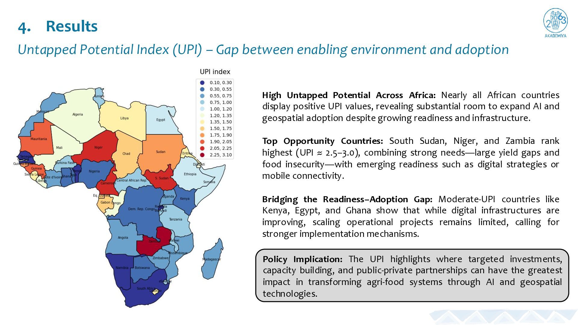 environment and adoption High Untapped Potential Across Africa: Nearly all African countries display positive UPI values, revealing substantial room to expand AI and geospatial adoption despite growing readiness and infrastructure. Top Opportunity Countries: South Sudan, Niger, and Zambia rank highest (UPI ≈ 2.5–3.0), combining strong needs—large yield gaps and food insecurity—with emerging readiness such as digital strategies or mobile connectivity. Bridging the Readiness–Adoption Gap: Moderate-UPI countries like Kenya, Egypt, and Ghana show that while digital infrastructures are improving, scaling operational projects remains limited, calling for stronger implementation mechanisms. Policy Implication: The UPI highlights where targeted investments, capacity building, and public-private partnerships can have the greatest impact in transforming agri-food systems through AI and geospatial technologies.