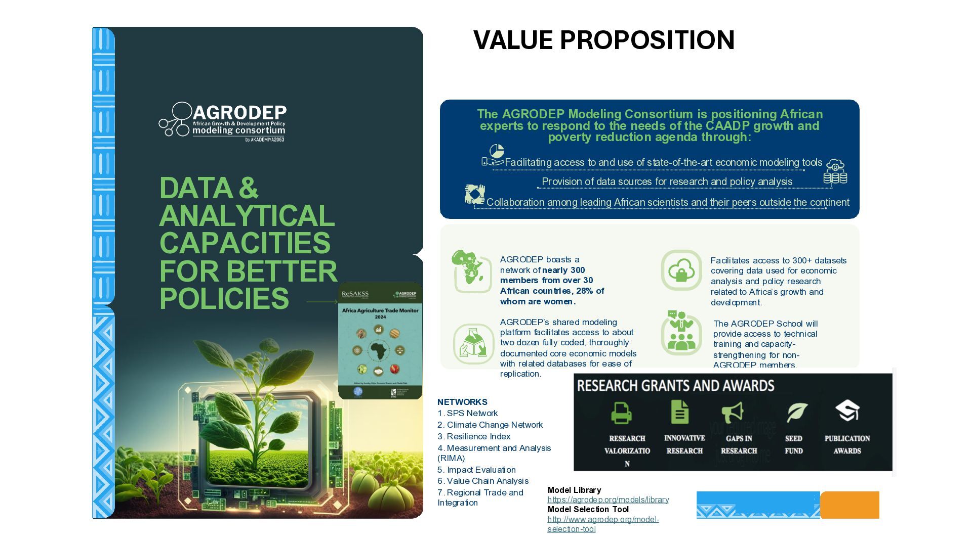 network of nearly 300 members from over 30 African countries, 28% of whom are women. AGRODEP’s shared modeling platform facilitates access to about two dozen fully coded, thoroughly documented core economic models with related databases for ease of replication. Facilitates access to 300+ datasets covering data used for economic analysis and policy research related to Africa’s growth and development. The AGRODEP School will provide access to technical training and capacity- strengthening for non- AGRODEP members. The AGRODEP Modeling Consortium is positioning African experts to respond to the needs of the CAADP growth and poverty reduction agenda through: Facilitating access to and use of state-of-the-art economic modeling tools Provision of data sources for research and policy analysis Collaboration among leading African scientists and their peers outside the continent NETWORKS 1. SPS Network 2. Climate Change Network 3. Resilience Index 4. Measurement and Analysis (RIMA) 5. Impact Evaluation 6. Value Chain Analysis 7. Regional Trade and Integration VALUE PROPOSITION Model Library https://agrodep.org/models/library Model Selection Tool http://www.agrodep.org/model- selection-tool
