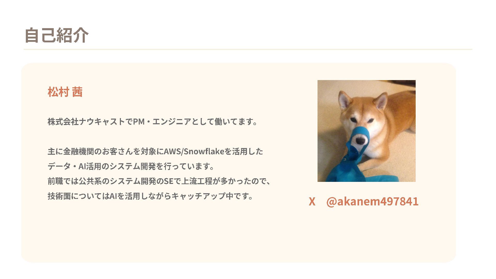 を活用した データ ・ AI活用のシステム開発を行っています 。 前職では公共系のシステム開発の SEで上流工程が多かったので 、 技術面については AIを活用しながらキャッチアップ中です 。 X @akanem497841