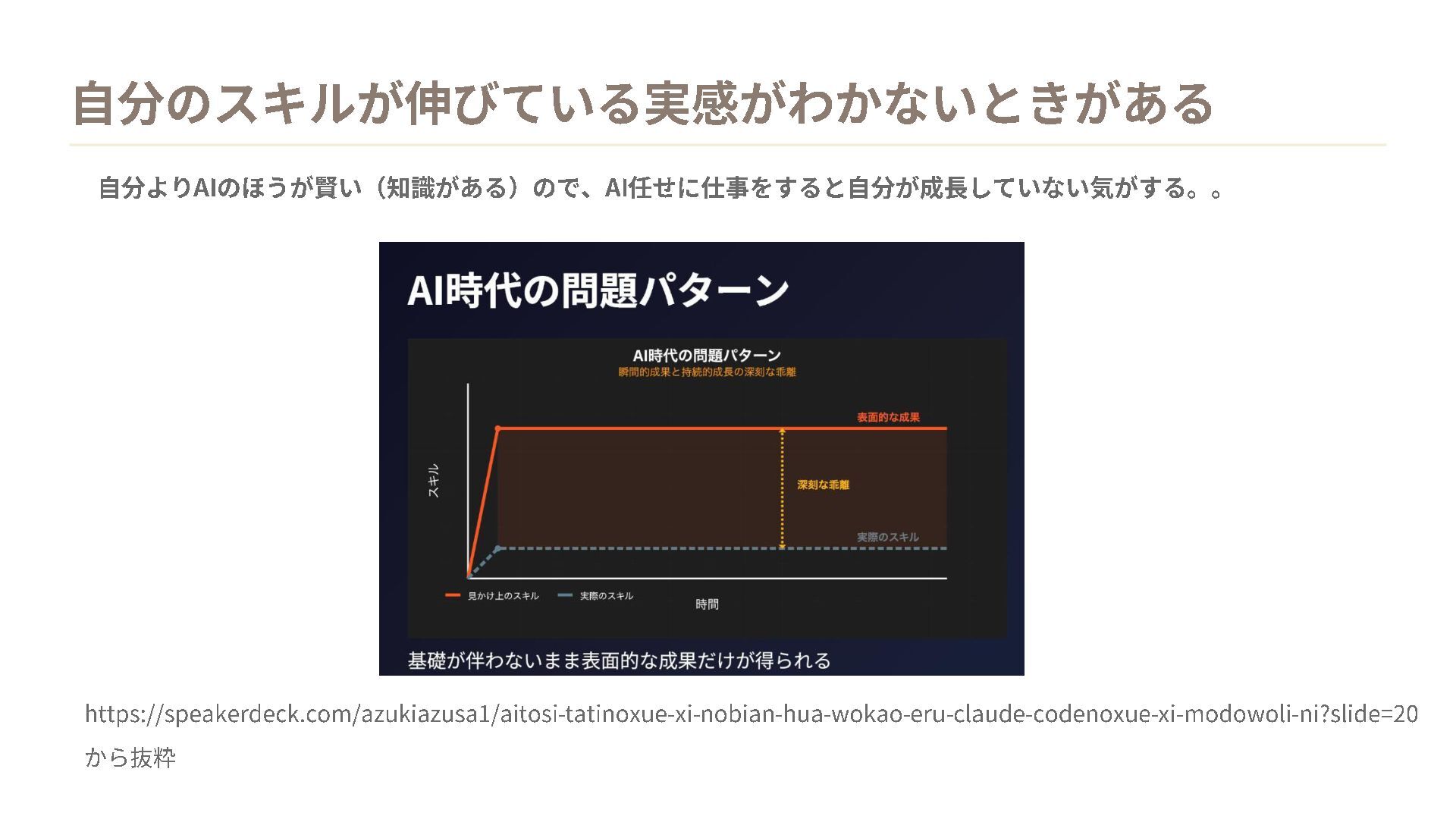 -ni?slide=20 から抜粋 自分より AIのほうが賢い(知識がある)ので、 AI任せに仕事をすると自分が成長していない気がする。。