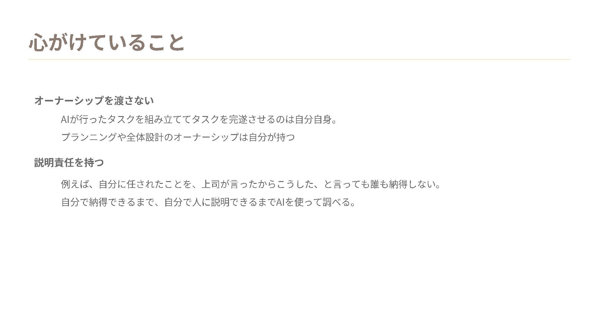 心がけていること オーナーシップを渡さない 説明責任を持つ AIが行ったタスクを組み立ててタスクを完遂させるのは自分自身。 プランニングや全体設計のオーナーシップは自分が持つ 例えば、 自分に任されたことを、上司が言ったからこうした、と言っても誰も納得しない。 自分で納得できるまで、自分で人に説明できるまで AIを使って調べる。