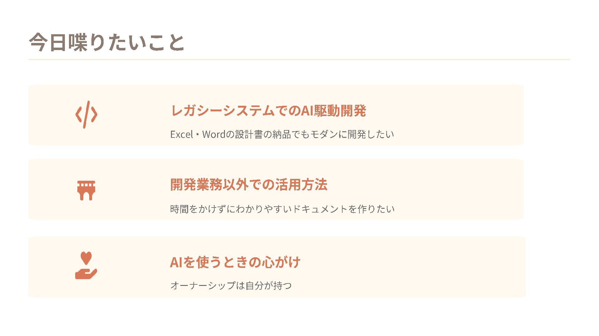 今日喋りたいこと レガシーシステムでの AI駆動開発 Excel ・ Word の設計書の納品でもモダンに開発したい AIを使うときの心がけ 開発業務以外での活用方法 時間をかけずにわかりやすいドキュメントを作りたい