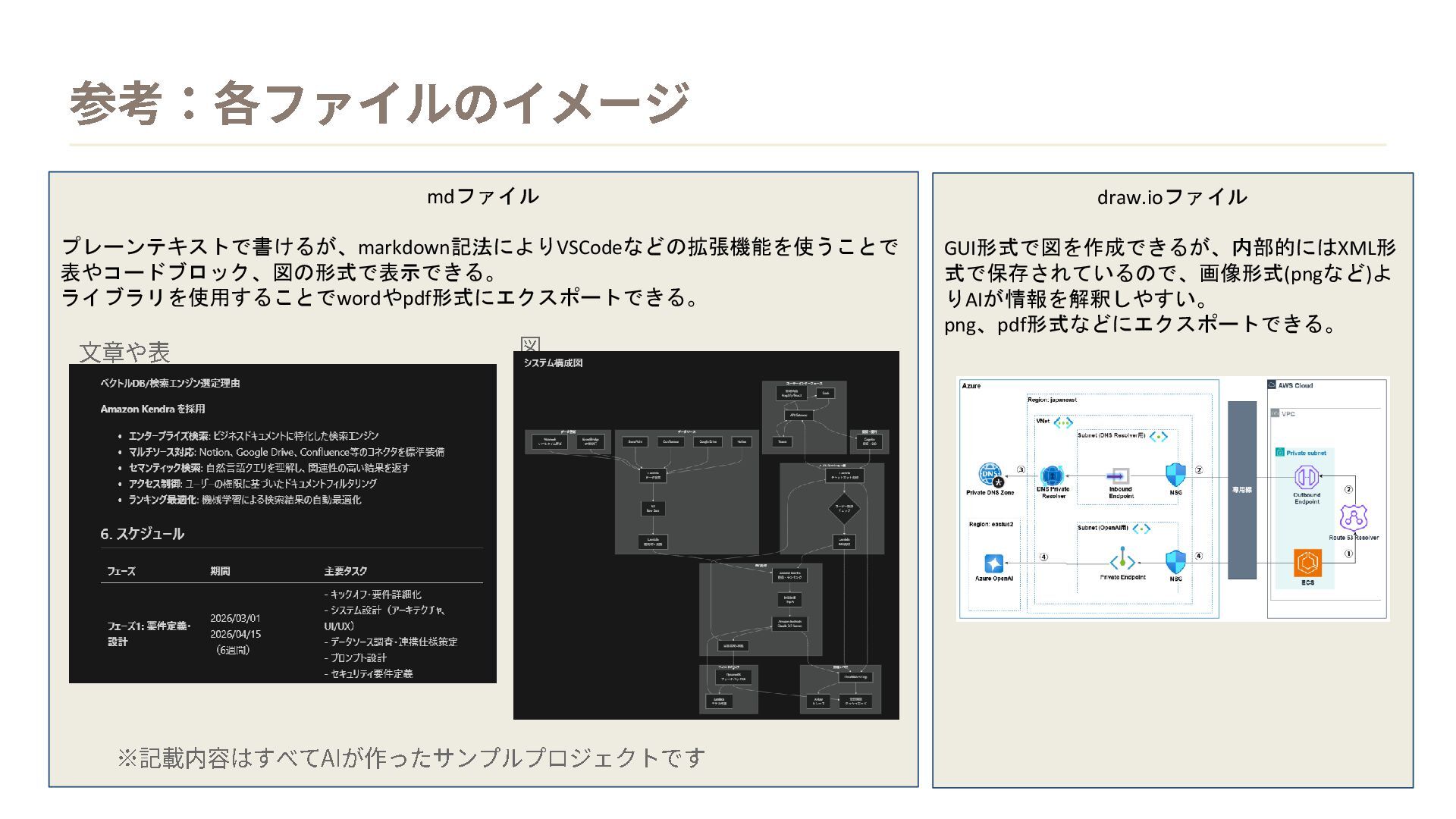 draw.ioファイル GUI形式で図を作成できるが、内部的にはXML形 式で保存されているので、画像形式(pngなど)よ りAIが情報を解釈しやすい。 png、pdf形式などにエクスポートできる。 mdファイル プレーンテキストで書けるが、markdown記法によりVSCodeなどの拡張機能を使うことで 表やコードブロック、図の形式で表示できる。 ライブラリを使用することでwordやpdf形式にエクスポートできる。 参考:各ファイルのイメージ