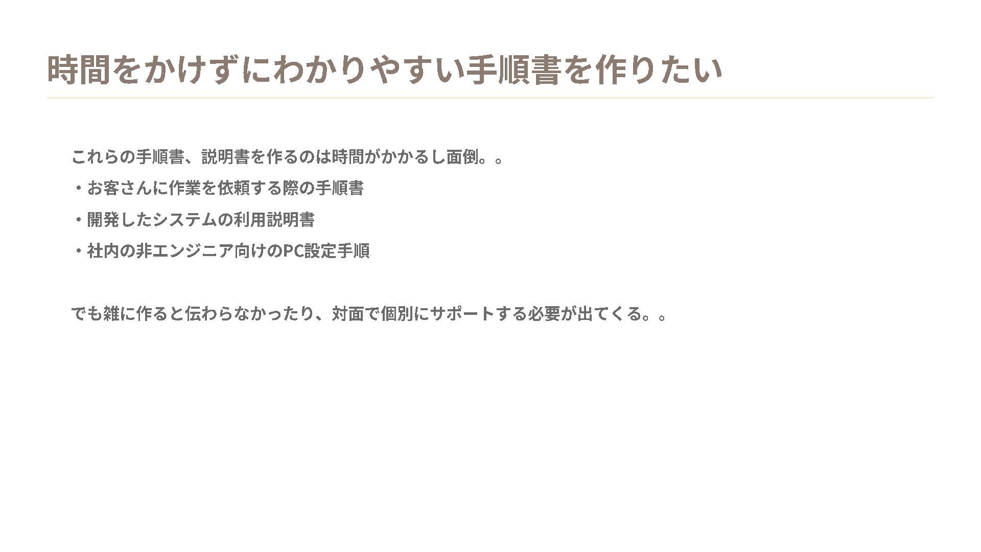時間をかけずにわかりやすい手順書を作りたい これらの手順書、説明書を作るのは時間がかかるし面倒。。 ・お客さんに作業を依頼する際の手順書 ・開発したシステムの利用説明書 ・社内の非エンジニア向けの PC設定手順 でも雑に作ると伝わらなかったり、対面で個別にサポートする必要が出てくる。。