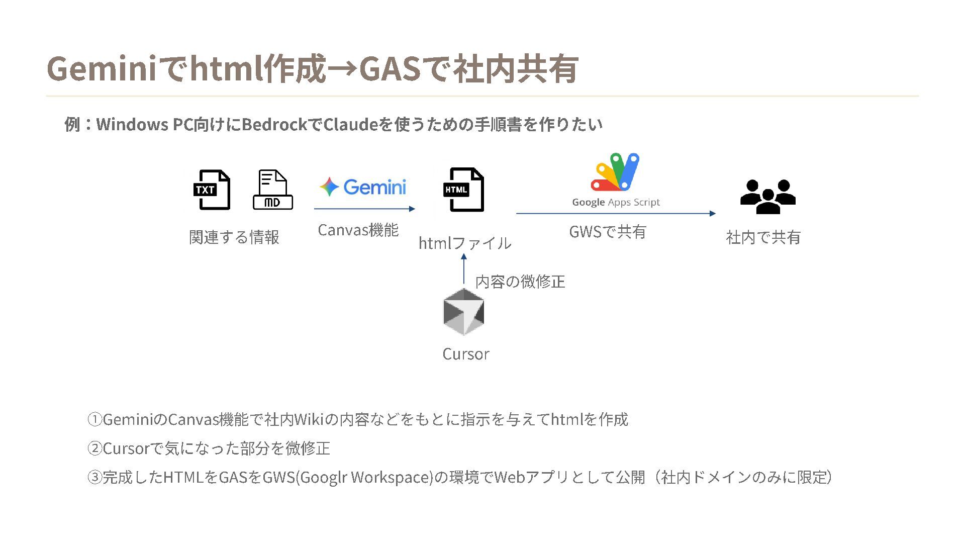 Gemini でhtml 作成→GASで社内共有 関連する情報 例: Windows PC 向けにBedrock でClaude を使うための手順書を作りたい
