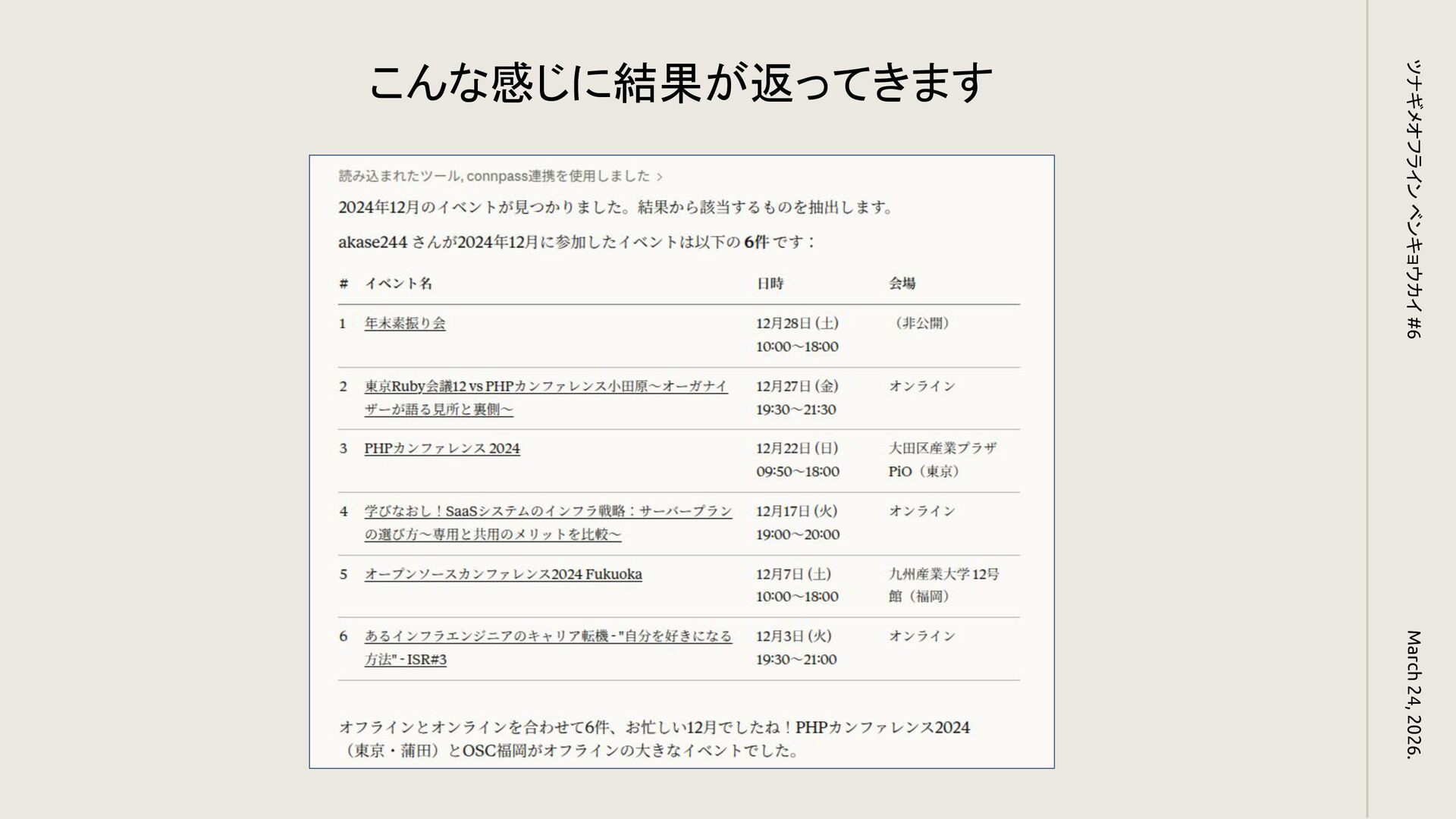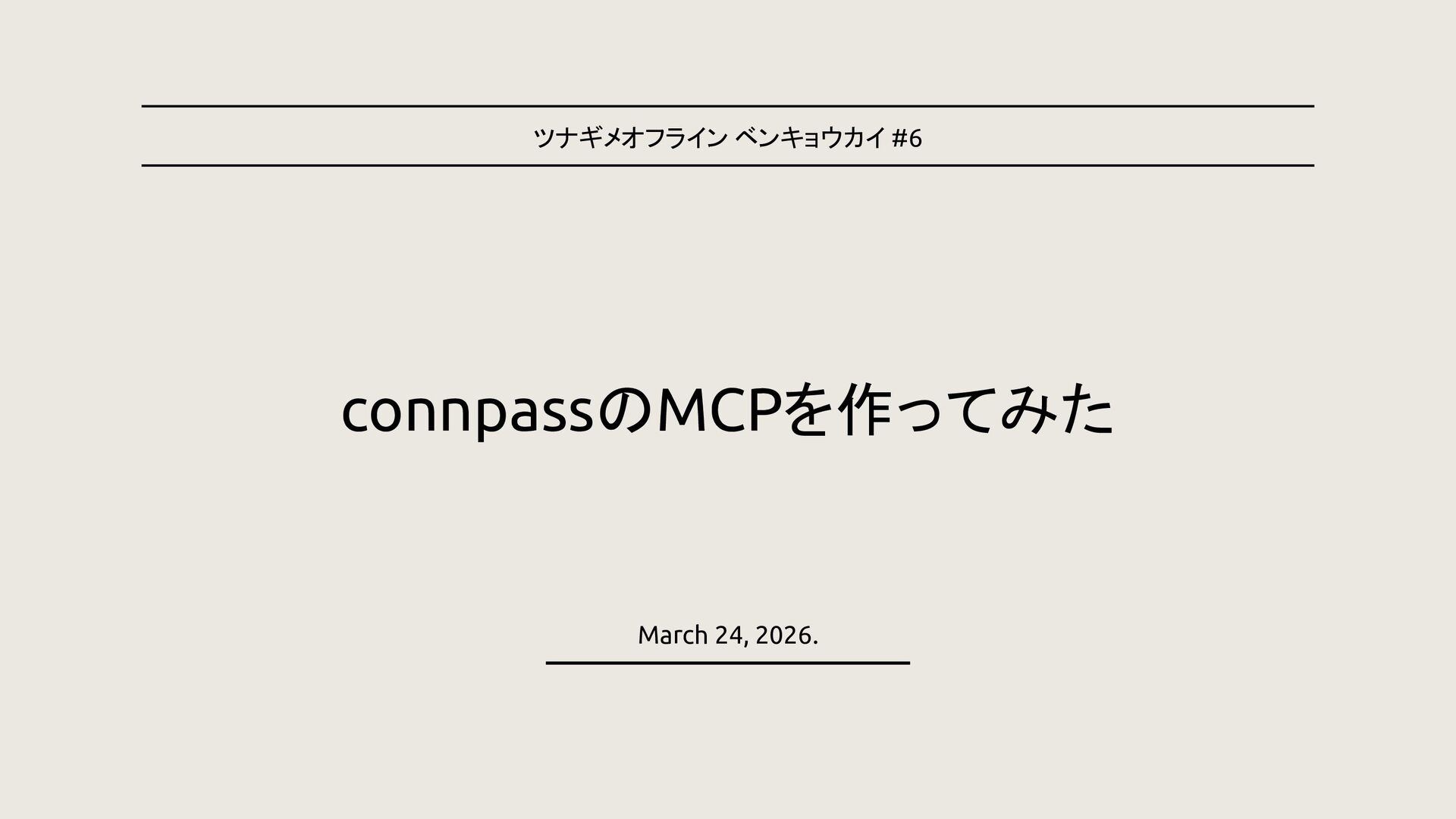 connpassのMCPを作ってみた ツナギメオフライン ベンキョウカイ #6 March 24, 2026.