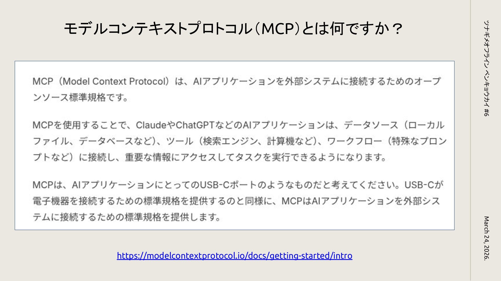 MCPとは? March 24, 2026. ツナギメオフライン ベンキョウカイ #6