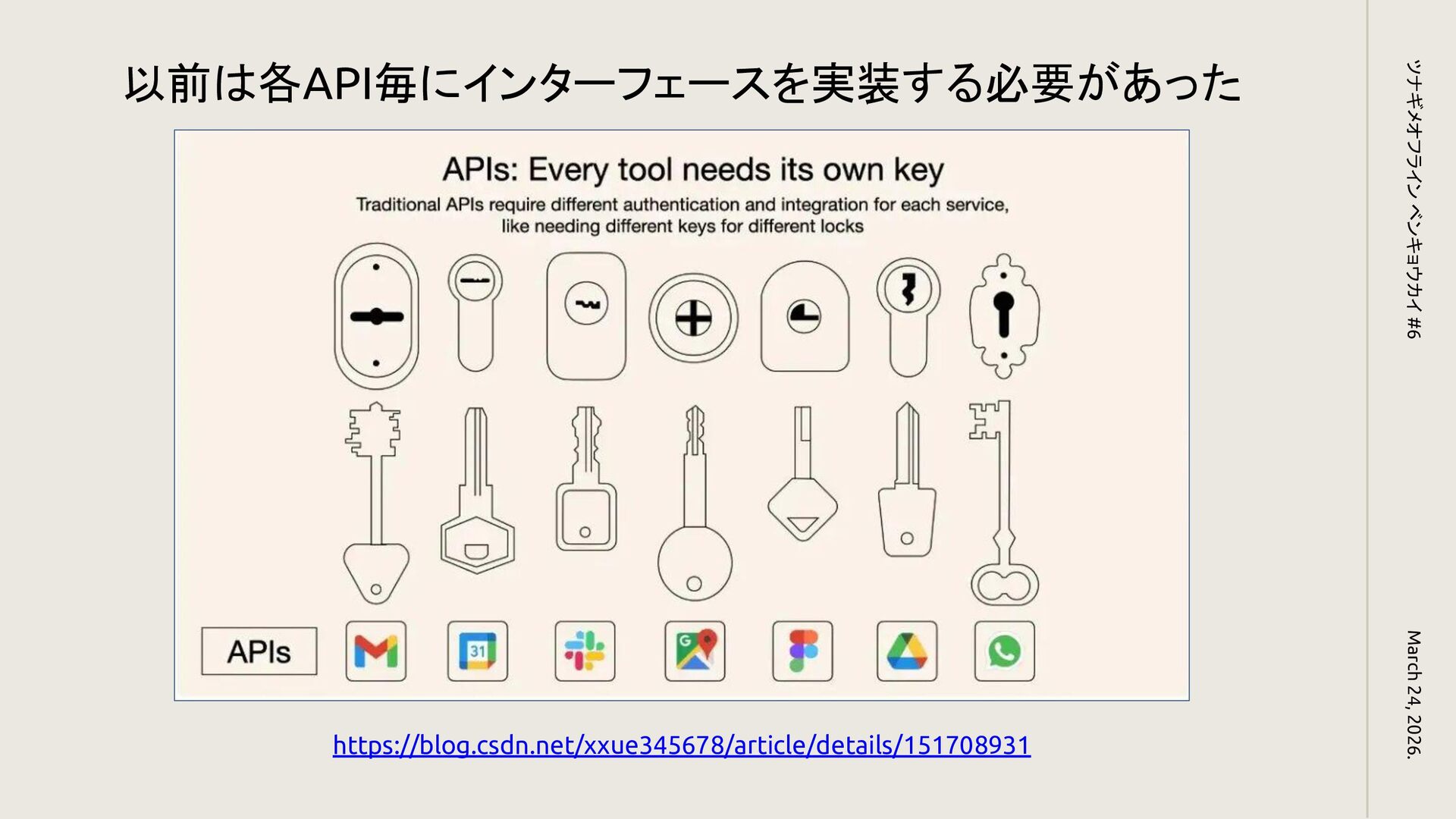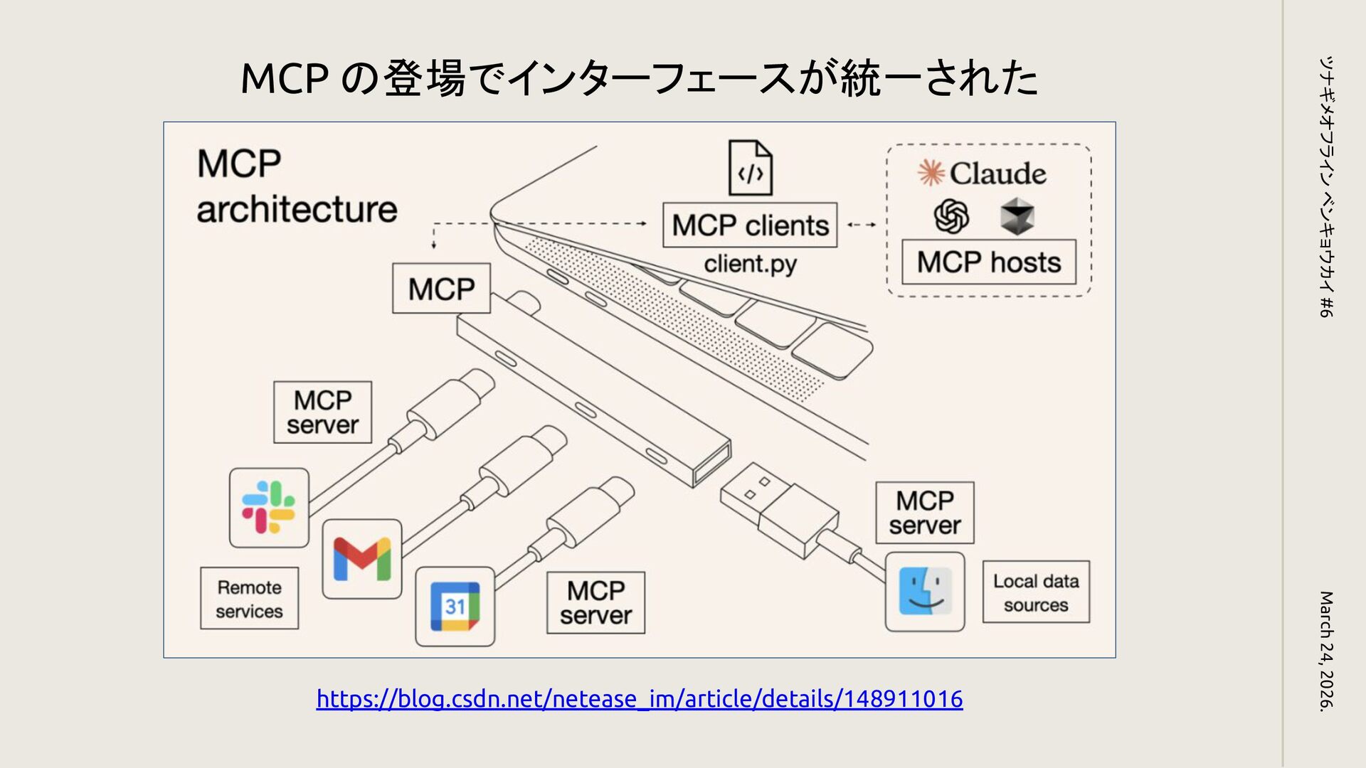 March 24, 2026. ツナギメオフライン ベンキョウカイ #6 https://blog.csdn.net/netease_im/article/details/148911016 MCP の登場でインターフェースが統一された