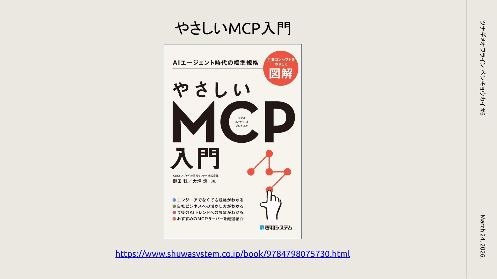 March 24, 2026. ツナギメオフライン ベンキョウカイ #6 https://www.shuwasystem.co.jp/book/9784798075730.html やさしいMCP入門