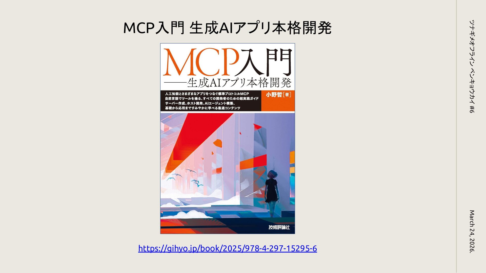 March 24, 2026. ツナギメオフライン ベンキョウカイ #6 https://gihyo.jp/book/2025/978-4-297-15295-6 MCP入門 生成AIアプリ本格開発
