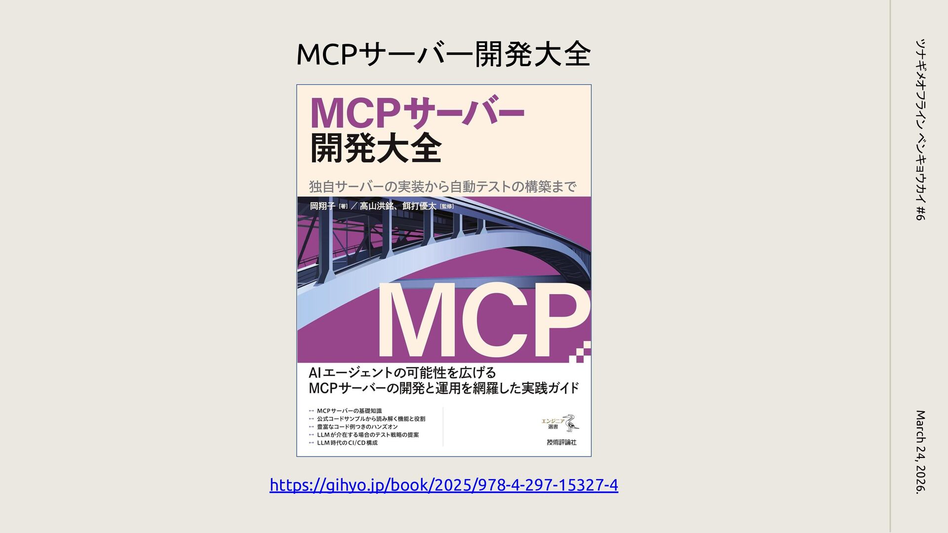 March 24, 2026. ツナギメオフライン ベンキョウカイ #6 https://gihyo.jp/book/2025/978-4-297-15327-4 MCPサーバー開発大全