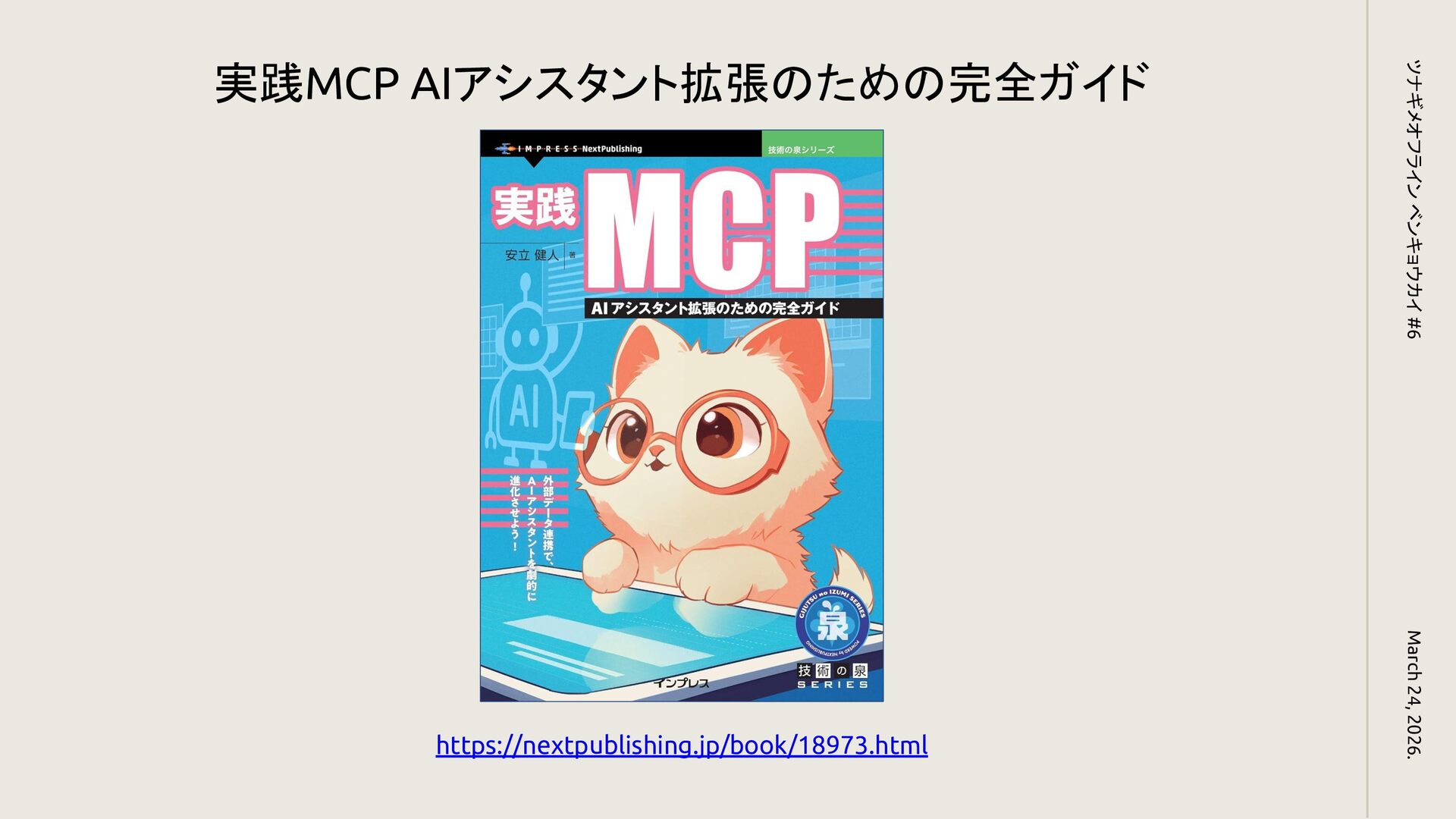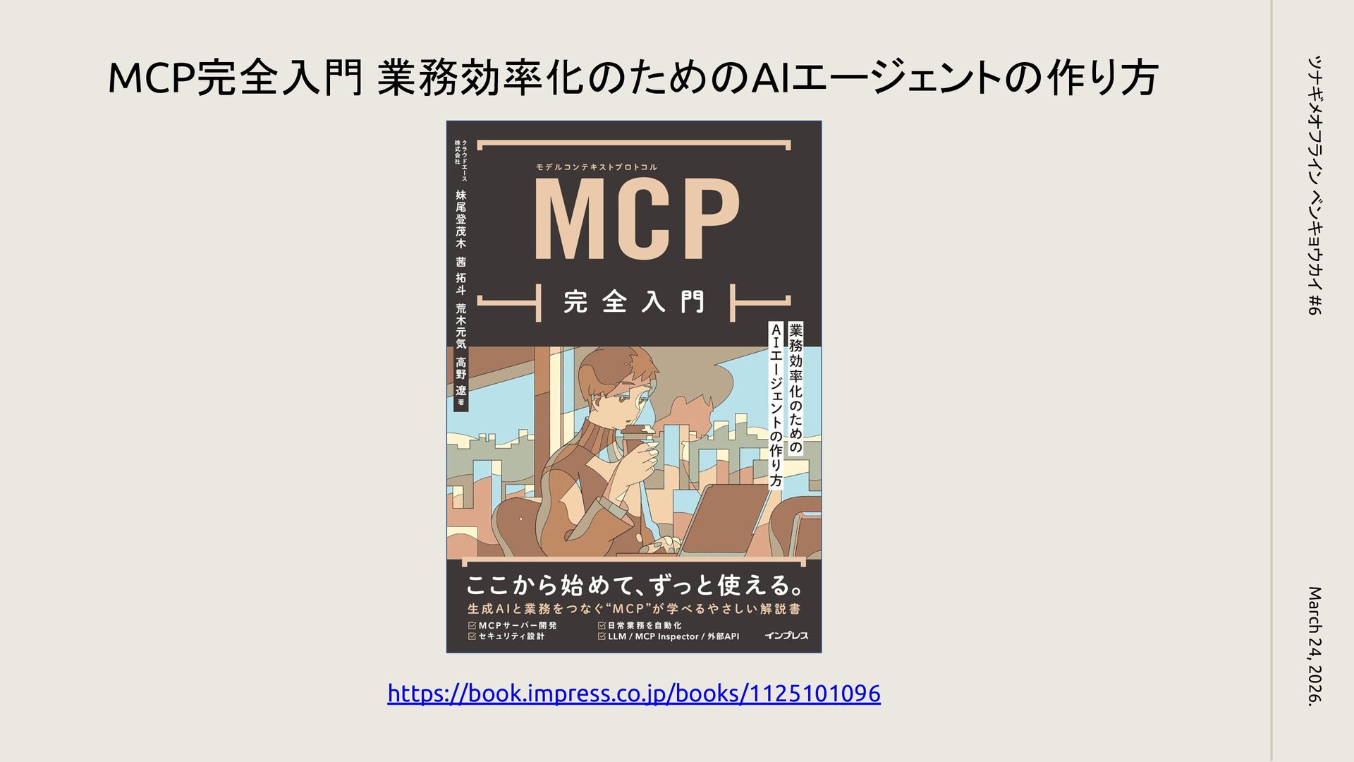 March 24, 2026. ツナギメオフライン ベンキョウカイ #6 https://book.impress.co.jp/books/1125101096 MCP完全入門 業務効率化のためのAIエージェントの作り方