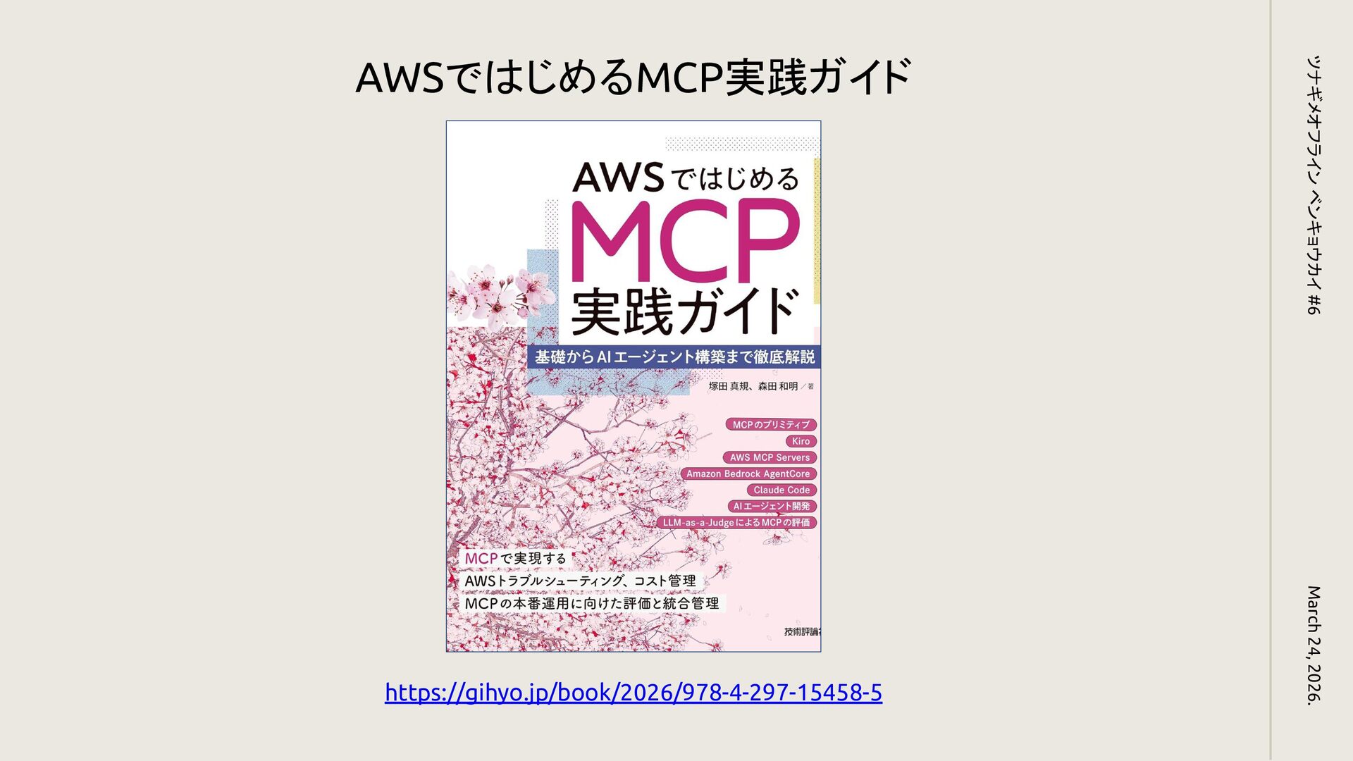 March 24, 2026. ツナギメオフライン ベンキョウカイ #6 https://gihyo.jp/book/2026/978-4-297-15458-5 AWSではじめるMCP実践ガイド