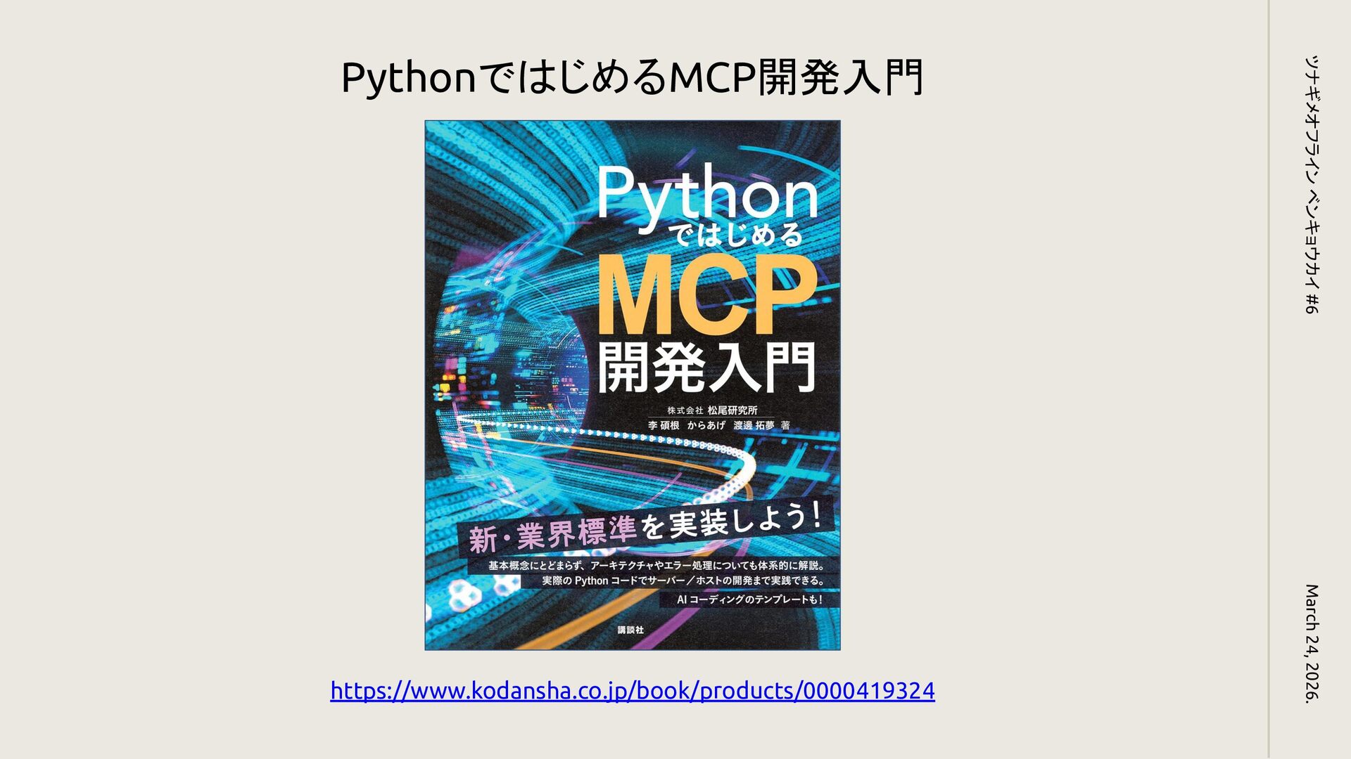 March 24, 2026. ツナギメオフライン ベンキョウカイ #6 https://www.kodansha.co.jp/book/products/0000419324 PythonではじめるMCP開発入門