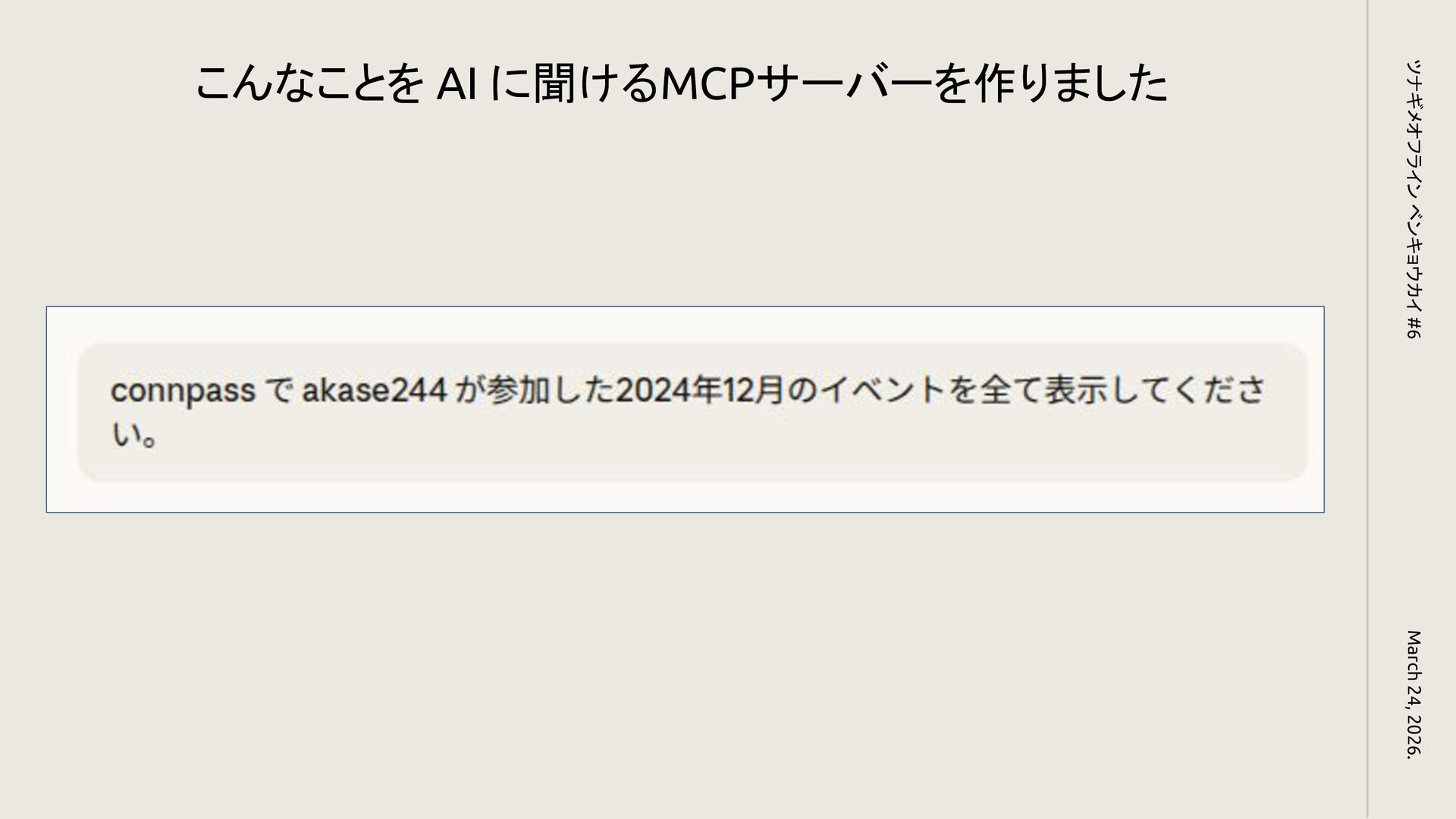 こんなことを AI に聞けるMCPサーバーを作りました March 24, 2026. ツナギメオフライン ベンキョウカイ #6