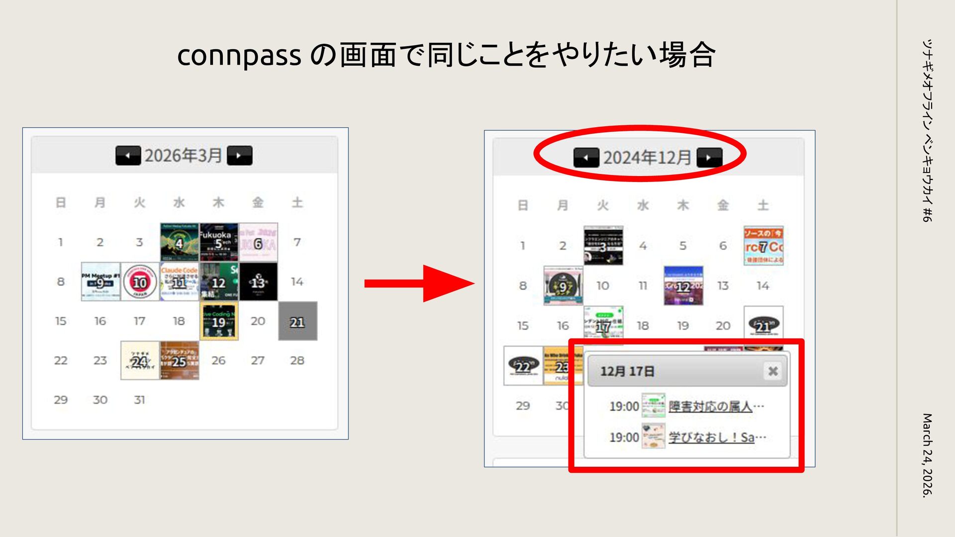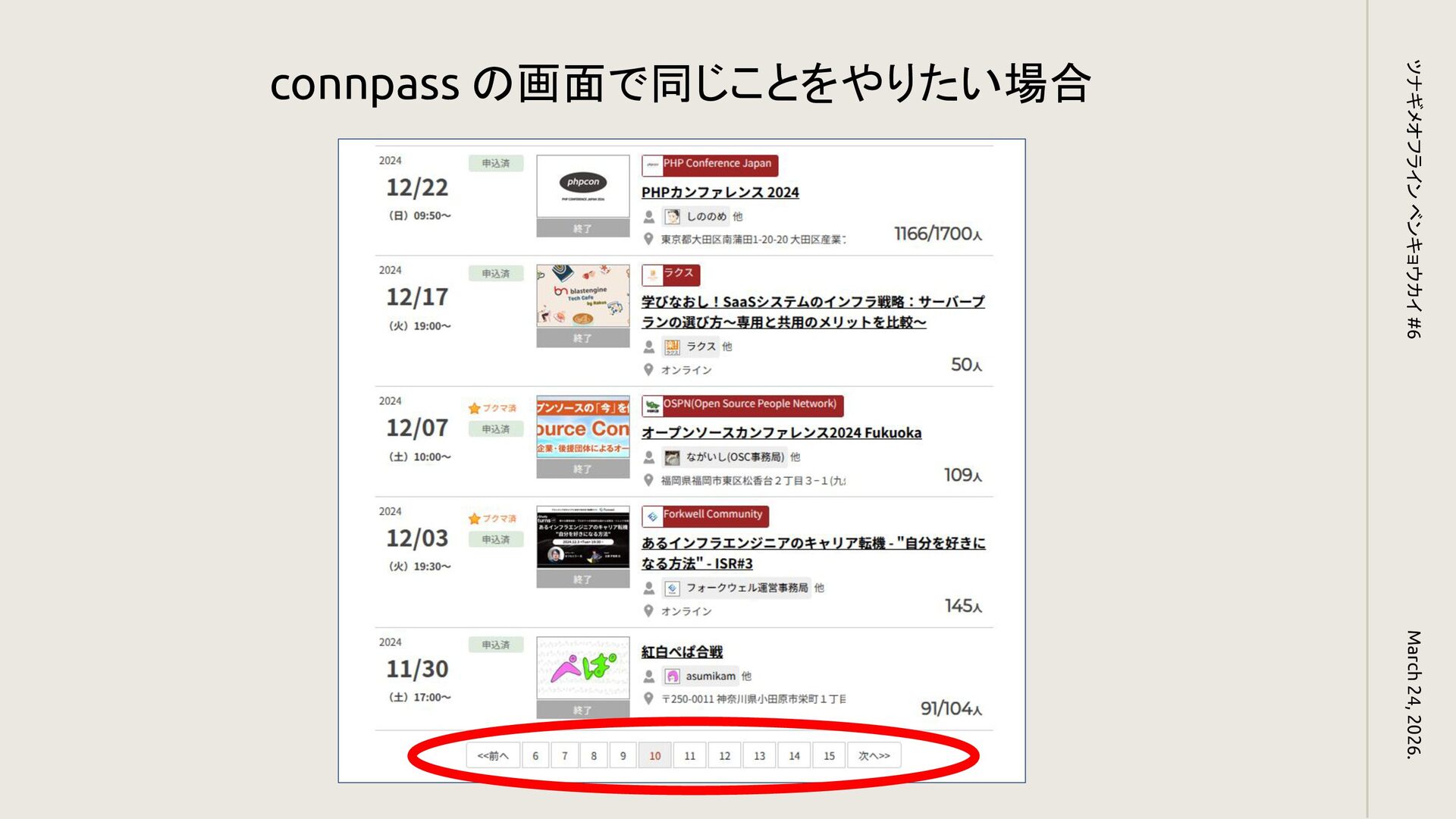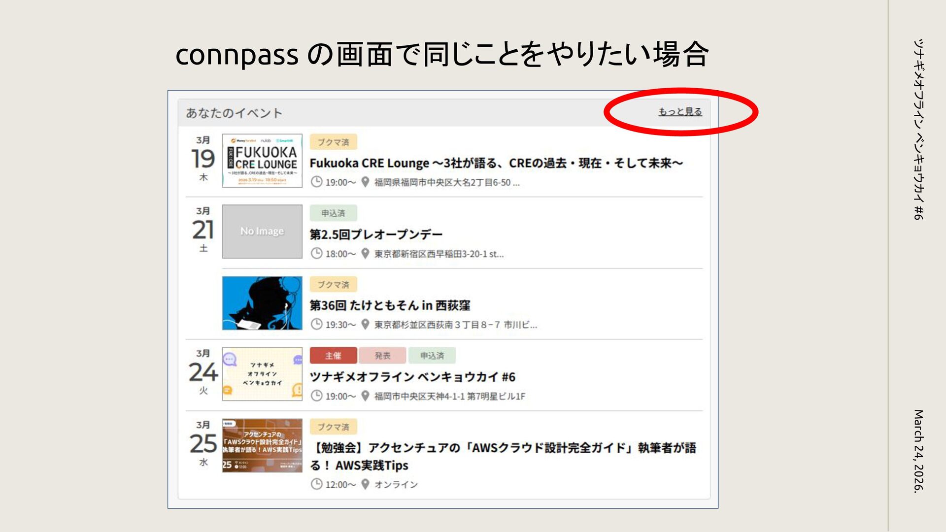 connpass の画面で同じことをやりたい場合 March 24, 2026. ツナギメオフライン ベンキョウカイ #6