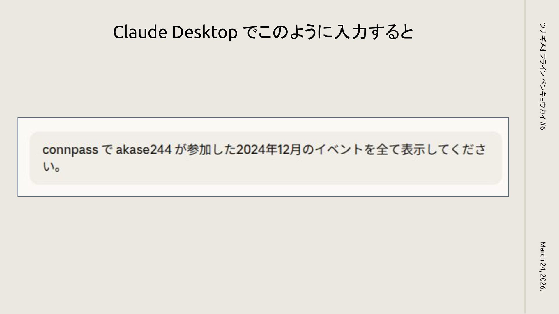 Claude Desktop でこのように入力すると March 24, 2026. ツナギメオフライン ベンキョウカイ #6