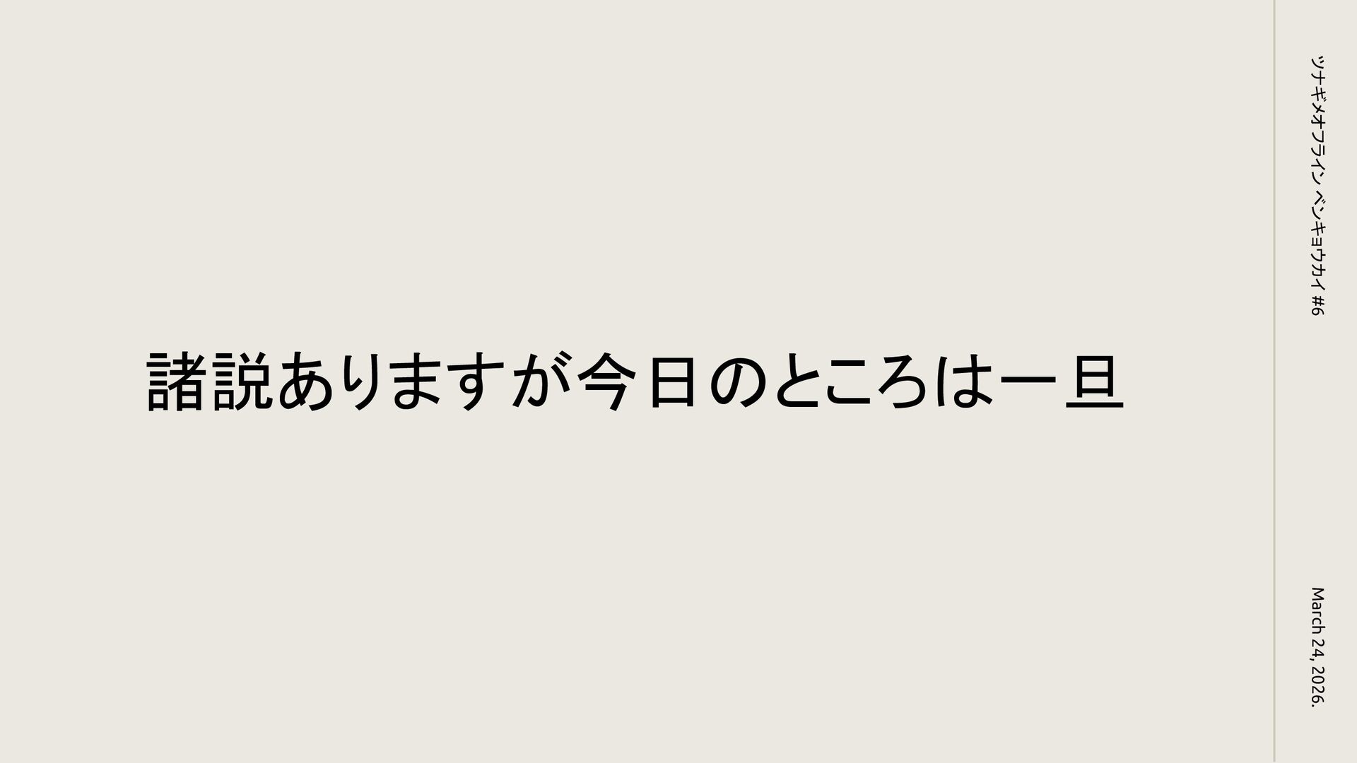 諸説ありますが今日のところは一旦 March 24, 2026. ツナギメオフライン ベンキョウカイ #6