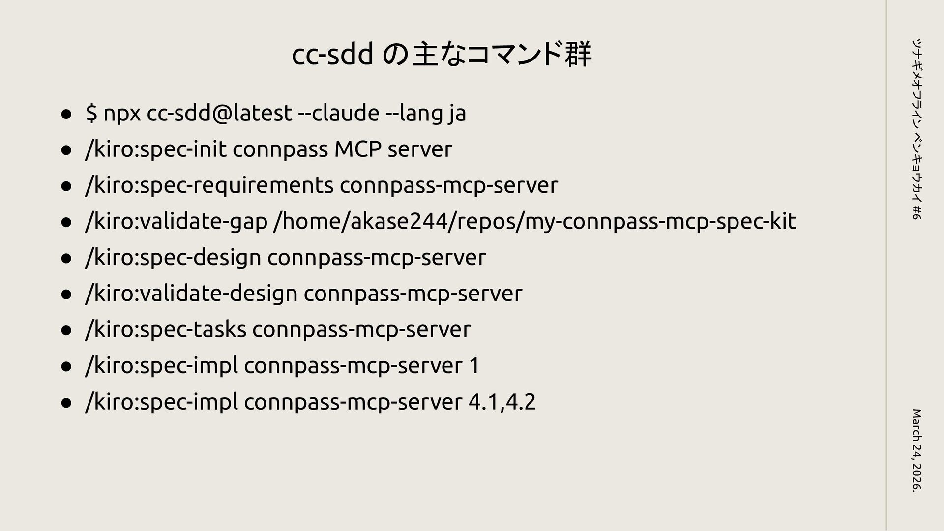 /kiro:spec-init connpass MCP server • /kiro:spec-requirements connpass-mcp-server • /kiro:validate-gap /home/akase244/repos/my-connpass-mcp-spec-kit • /kiro:spec-design connpass-mcp-server • /kiro:validate-design connpass-mcp-server • /kiro:spec-tasks connpass-mcp-server • /kiro:spec-impl connpass-mcp-server 1 • /kiro:spec-impl connpass-mcp-server 4.1,4.2 March 24, 2026. ツナギメオフライン ベンキョウカイ #6