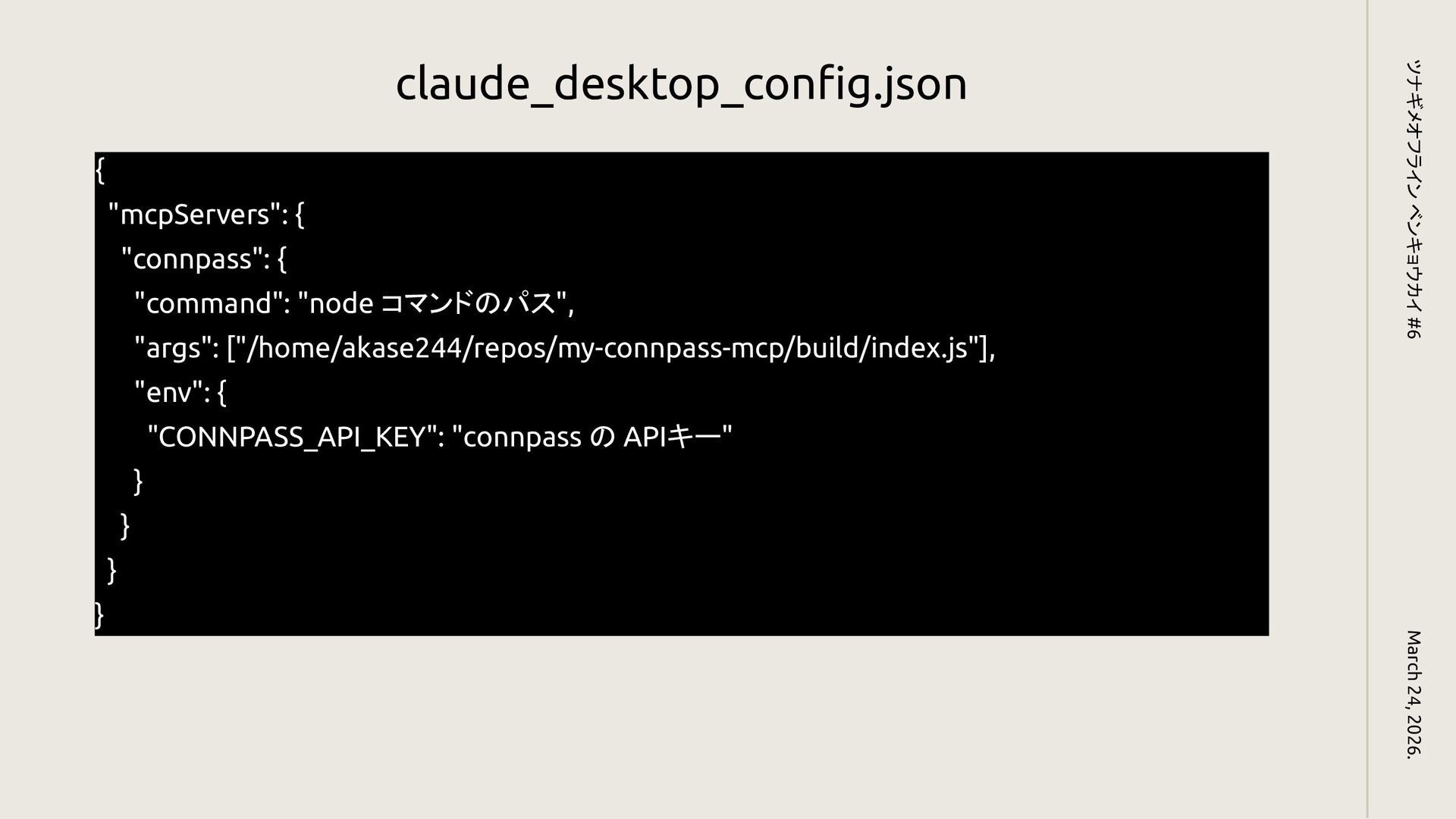 ["/home/akase244/repos/my-connpass-mcp/build/index.js"], "env": { "CONNPASS_API_KEY": "connpass の APIキー" } } } } March 24, 2026. ツナギメオフライン ベンキョウカイ #6