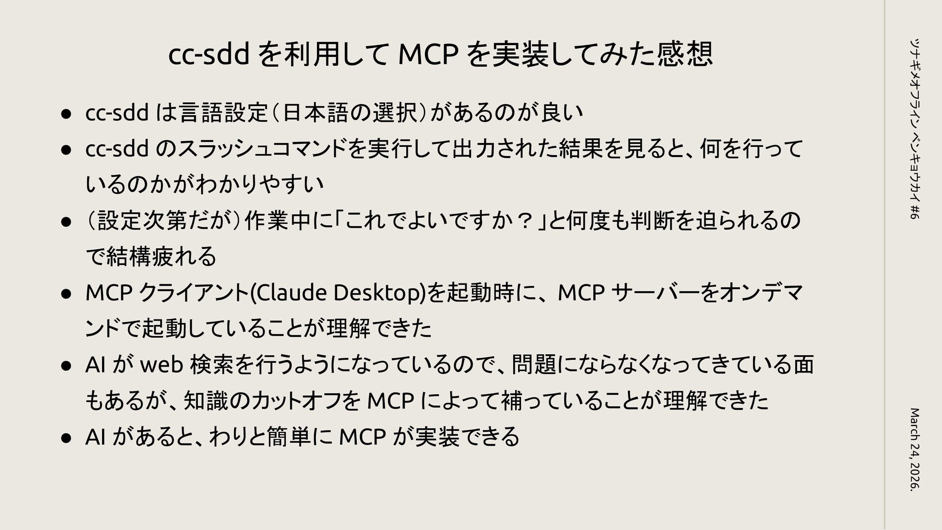 いるのかがわかりやすい • (設定次第だが)作業中に「これでよいですか?」と何度も判断を迫られるの で結構疲れる • MCP クライアント(Claude Desktop)を起動時に、 MCP サーバーをオンデマ ンドで起動していることが理解できた • AI が web 検索を行うようになっているので、問題にならなくなってきている面 もあるが、知識のカットオフを MCP によって補っていることが理解できた • AI があると、わりと簡単に MCP が実装できる March 24, 2026. ツナギメオフライン ベンキョウカイ #6