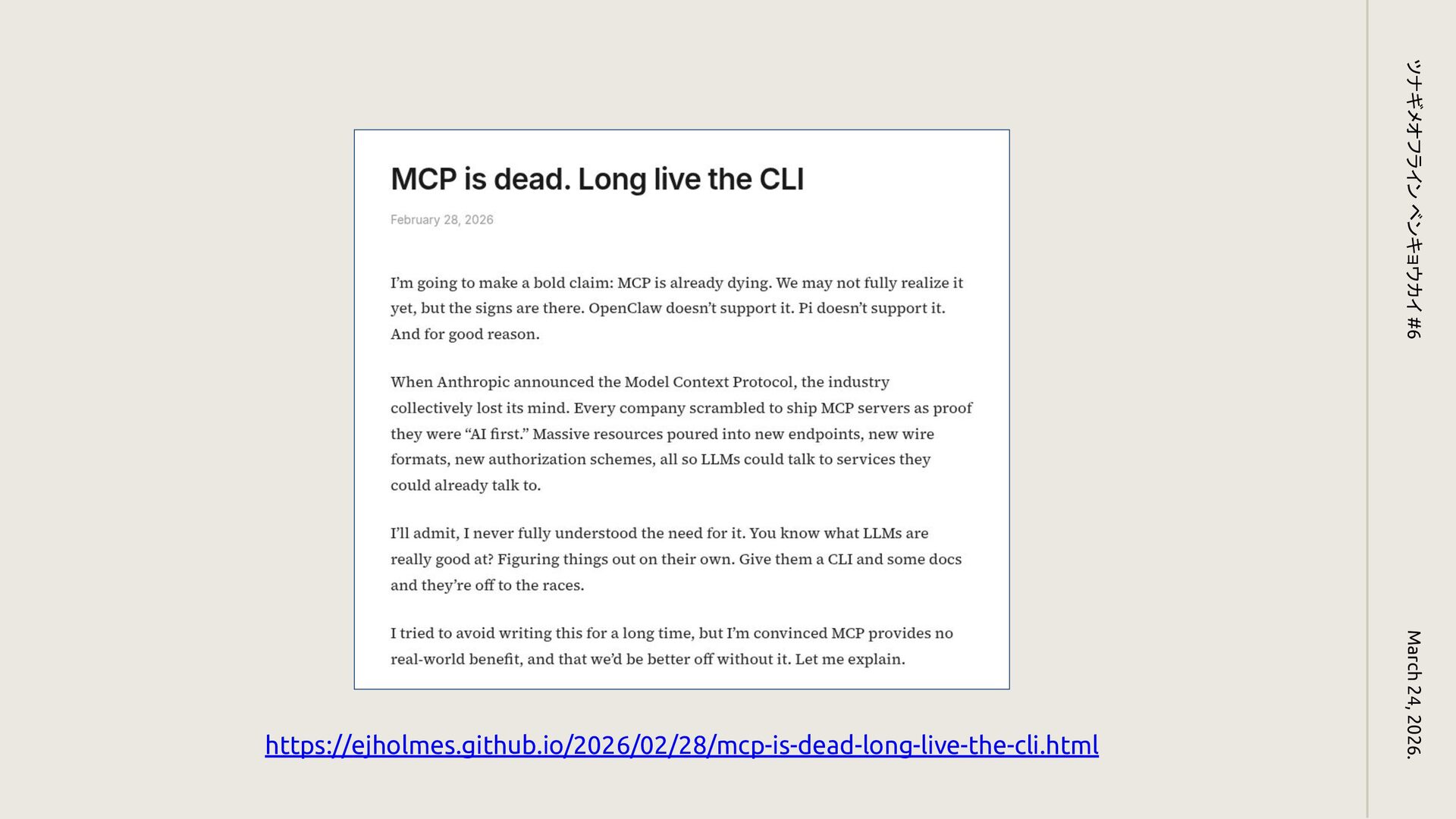 https://ejholmes.github.io/2026/02/28/mcp-is-dead-long-live-the-cli.html March 24, 2026. ツナギメオフライン ベンキョウカイ #6