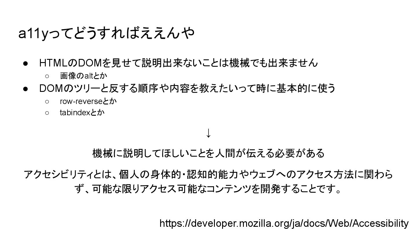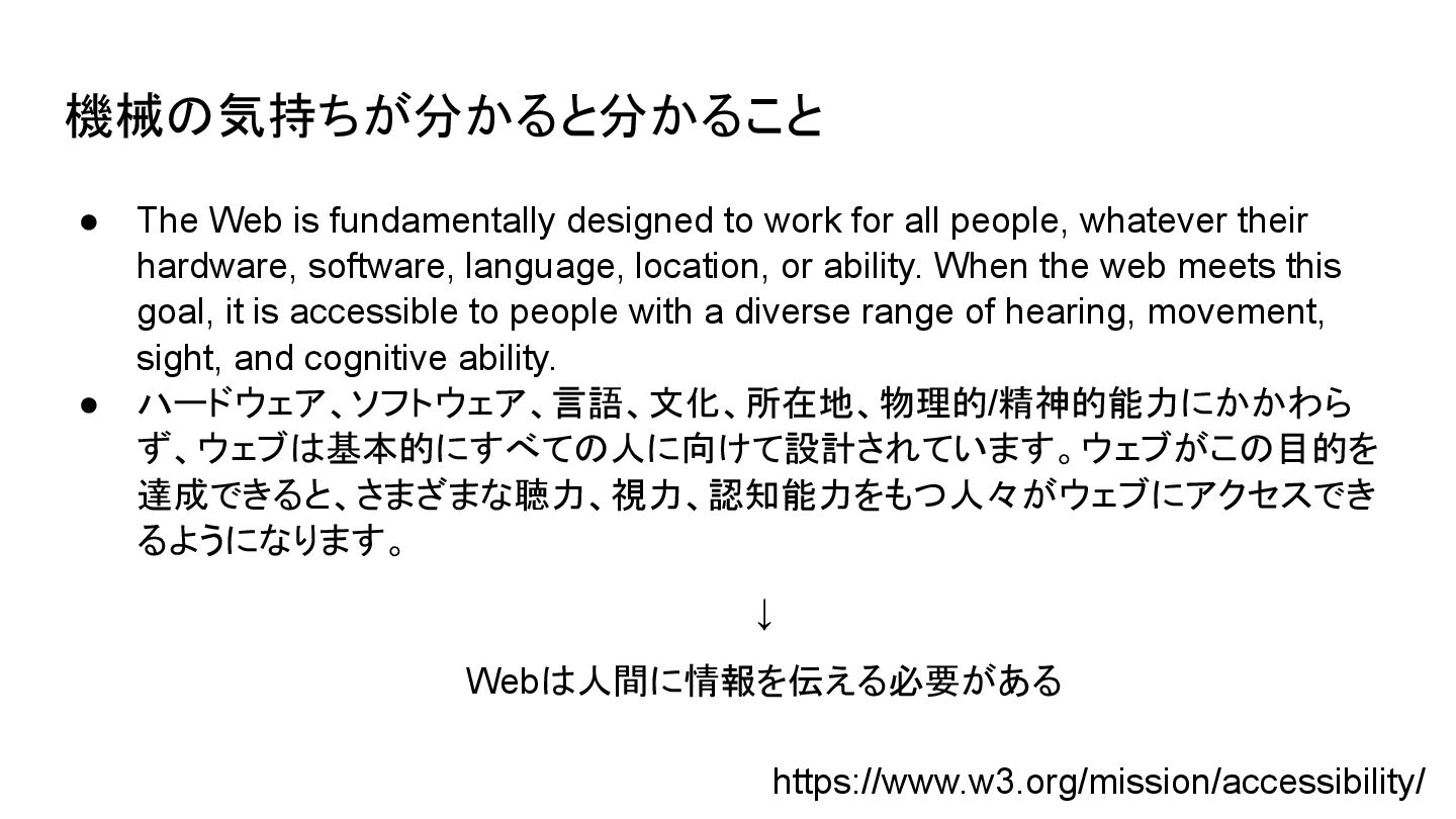 all people, whatever their hardware, software, language, location, or ability. When the web meets this goal, it is accessible to people with a diverse range of hearing, movement, sight, and cognitive ability. • ハードウェア、ソフトウェア、言語、文化、所在地、物理的/精神的能力にかかわら ず、ウェブは基本的にすべての人に向けて設計されています。ウェブがこの目的を 達成できると、さまざまな聴力、視力、認知能力をもつ人々がウェブにアクセスでき るようになります。 ↓ Webは人間に情報を伝える必要がある https://www.w3.org/mission/accessibility/