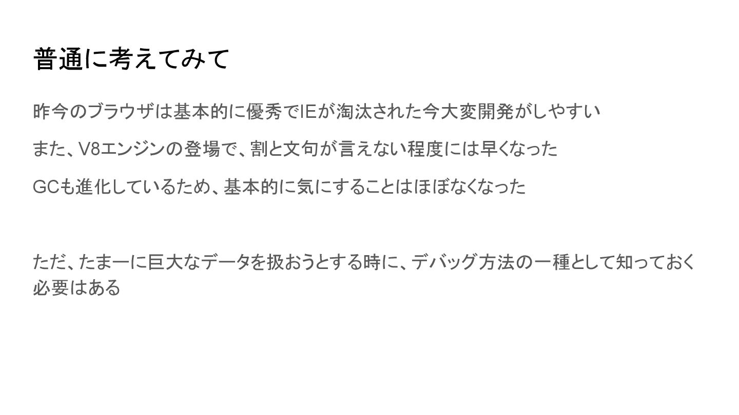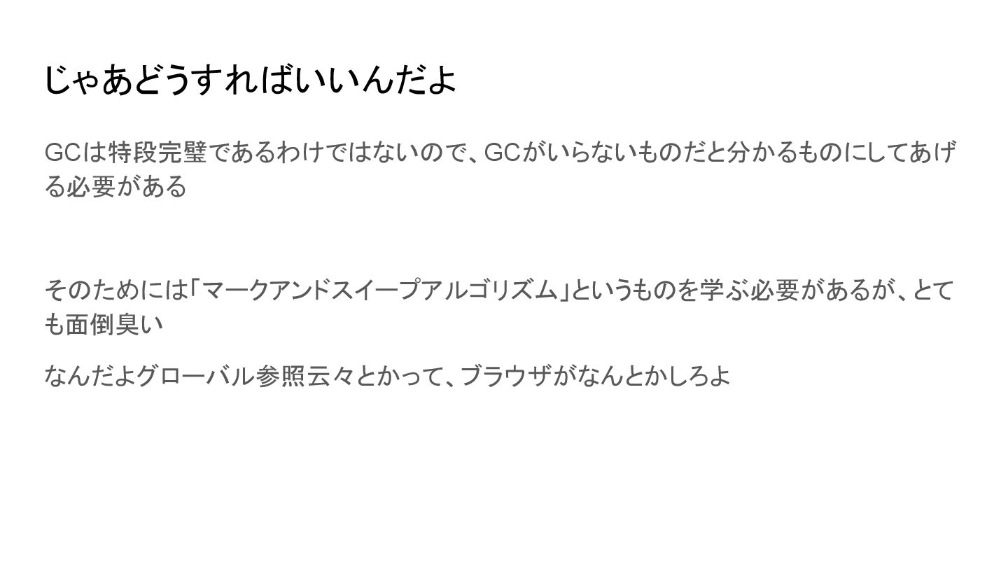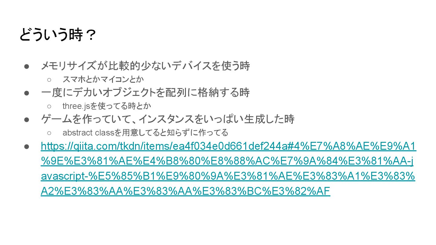 ゲームを作っていて、インスタンスをいっぱい生成した時 ◦ abstract classを用意してると知らずに作ってる • https://qiita.com/tkdn/items/ea4f034e0d661def244a#4%E7%A8%AE%E9%A1 %9E%E3%81%AE%E4%B8%80%E8%88%AC%E7%9A%84%E3%81%AA-j avascript-%E5%85%B1%E9%80%9A%E3%81%AE%E3%83%A1%E3%83% A2%E3%83%AA%E3%83%AA%E3%83%BC%E3%82%AF