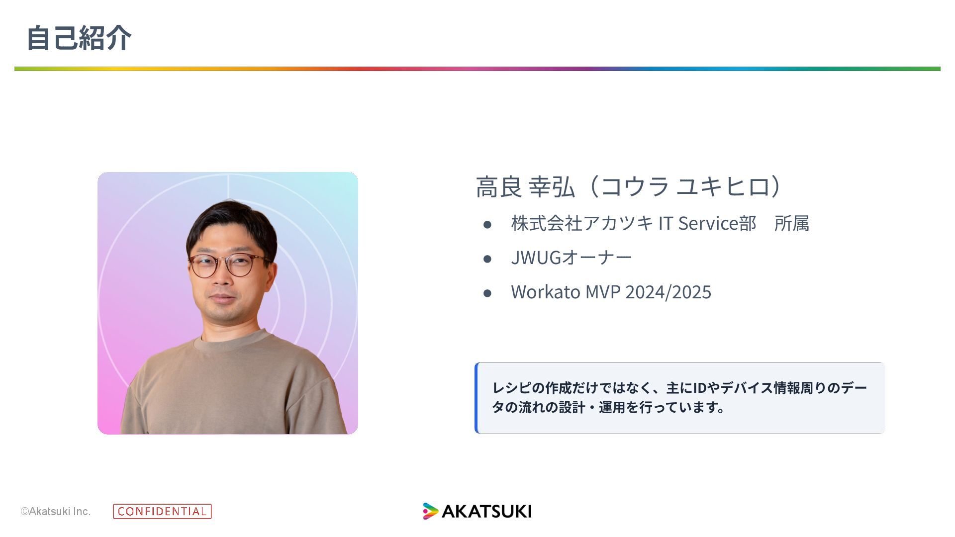 ©Akatsuki Inc. ⾼良 幸弘(コウラ ユキヒロ) • 株式会社アカツキ IT Service部 所属 •