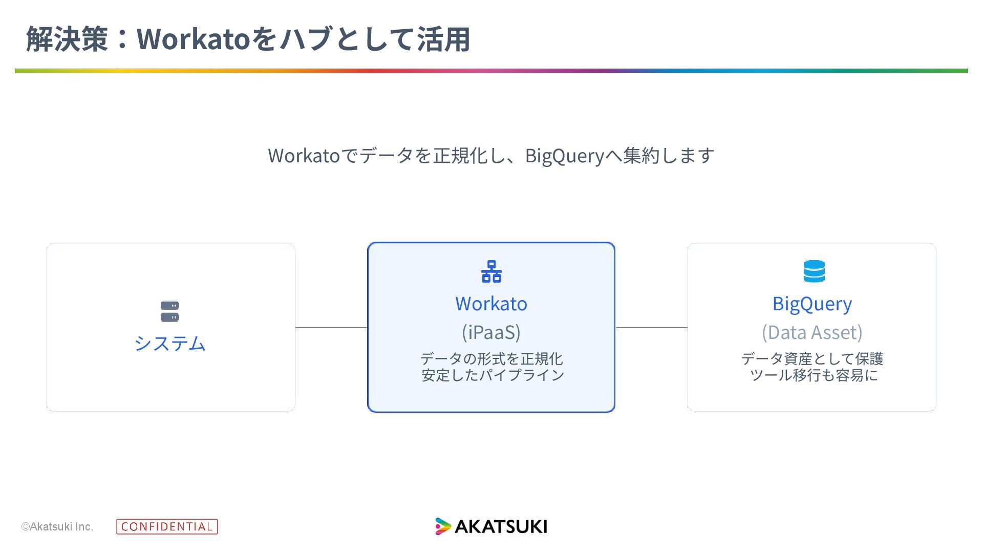 ©Akatsuki Inc. Workatoでデータを正規化し、BigQueryへ集約します システム Workato (iPaaS) データの形式を正規化 安定したパイプライン BigQuery (Data