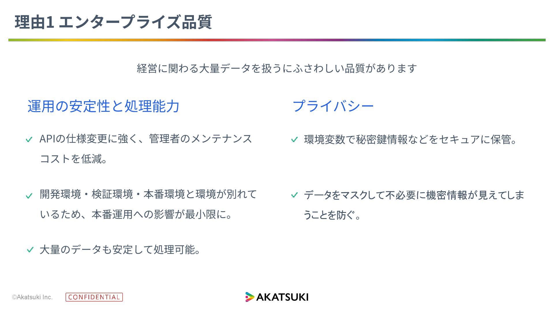 ©Akatsuki Inc. プライバシー 経営に関わる⼤量データを扱うにふさわしい品質があります 環境変数で秘密鍵情報などをセキュアに保管。 APIの仕様変更に強く、管理者のメンテナンス コストを低減。 理由1 エンタープライズ品質 運⽤の安定性と処理能⼒