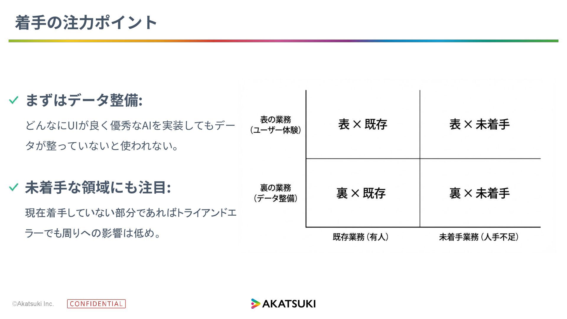 ©Akatsuki Inc. 着⼿の注⼒ポイント まずはデータ整備: どんなにUIが良く優秀なAIを実装してもデー タが整っていないと使われない。 未着⼿な領域にも注⽬: 現在着手していない部分であればトライアンドエ ラーでも周りへの影響は低め。