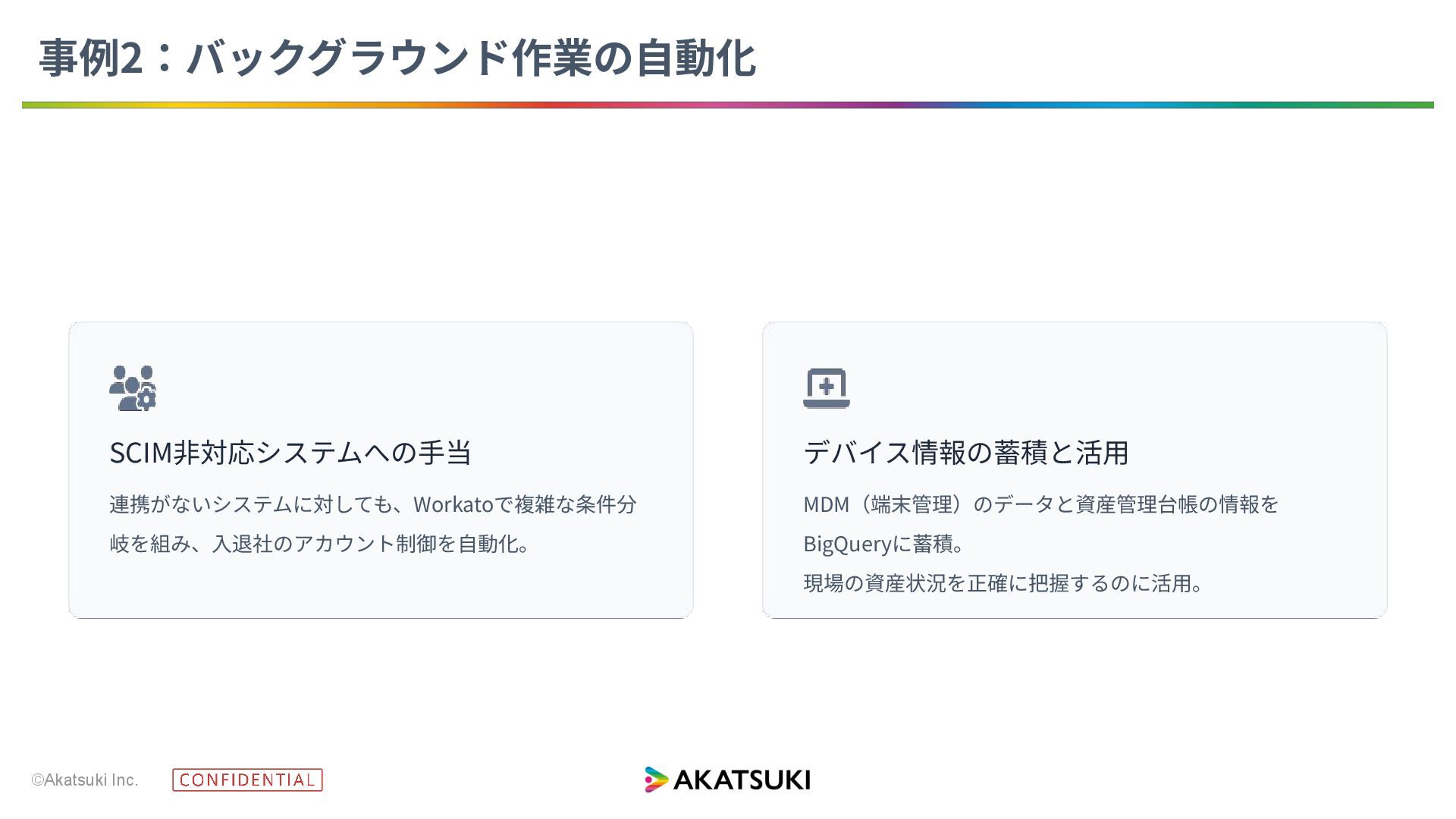 ©Akatsuki Inc. SCIM⾮対応システムへの⼿当 連携がないシステムに対しても、Workatoで複雑な条件分 岐を組み、⼊退社のアカウント制御を⾃動化。 デバイス情報の蓄積と活⽤ MDM(端末管理)のデータと資産管理台帳の情報を BigQueryに蓄積。 現場の資産状況を正確に把握するのに活⽤。 事例2:バックグラウンド作業の⾃動化