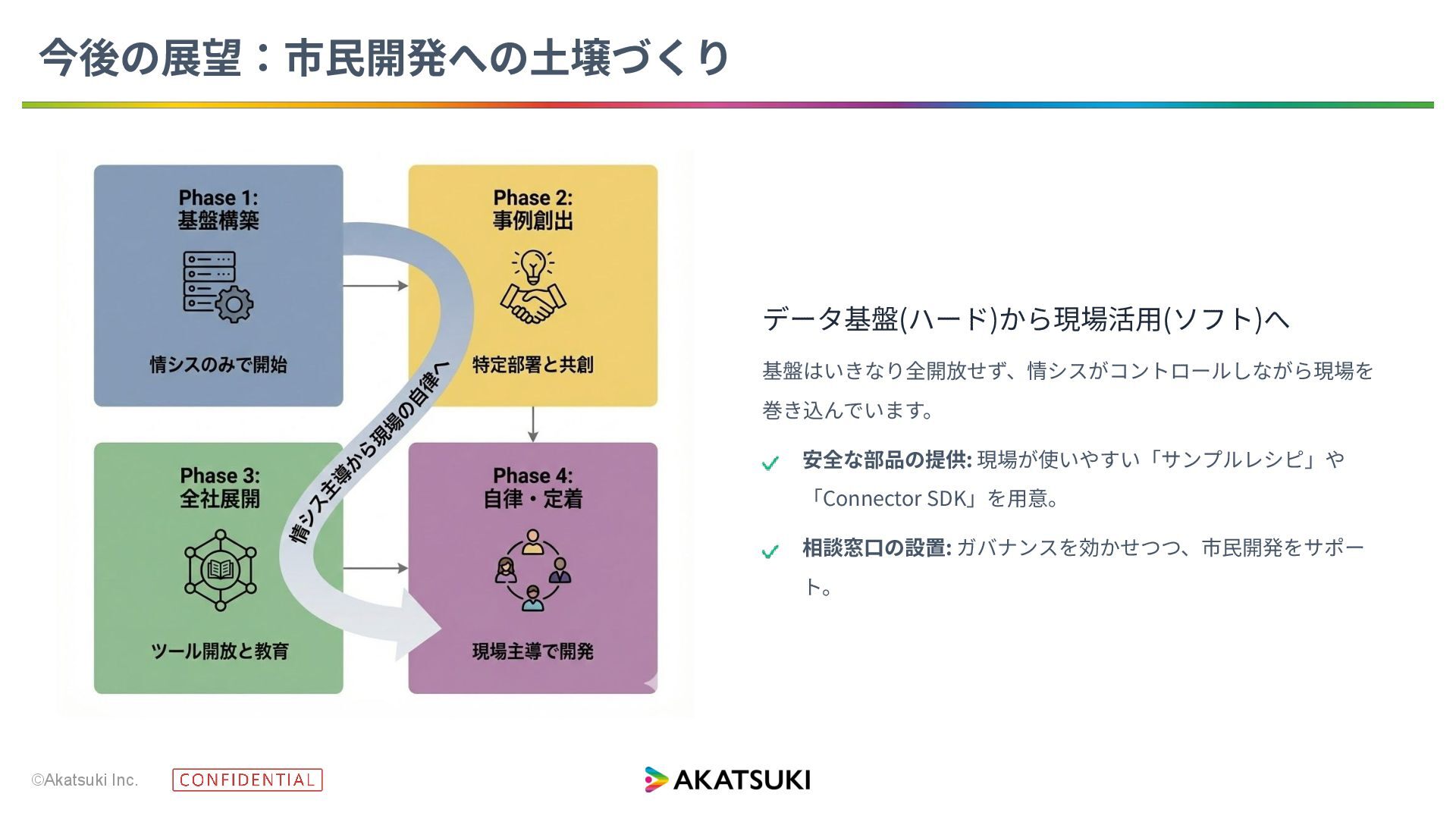 ©Akatsuki Inc. データ基盤(ハード)から現場活⽤(ソフト)へ 基盤はいきなり全開放せず、情シスがコントロールしながら現場を 巻き込んでいます。 安全な部品の提供: 現場が使いやすい「サンプルレシピ」や 「Connector SDK」を⽤意。 相談窓⼝の設置: