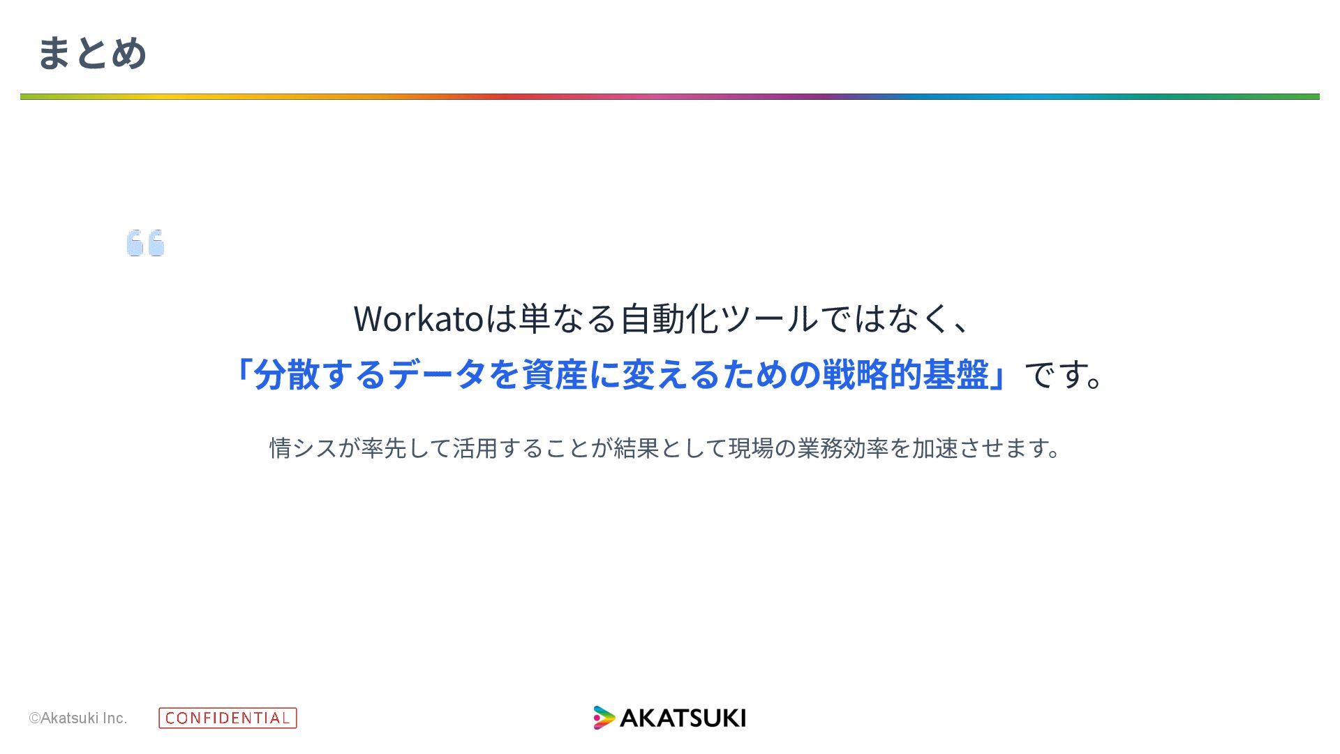 ©Akatsuki Inc. Workatoは単なる⾃動化ツールではなく、 「分散するデータを資産に変えるための戦略的基盤」です。 情シスが率先して活⽤することが結果として現場の業務効率を加速させます。 まとめ