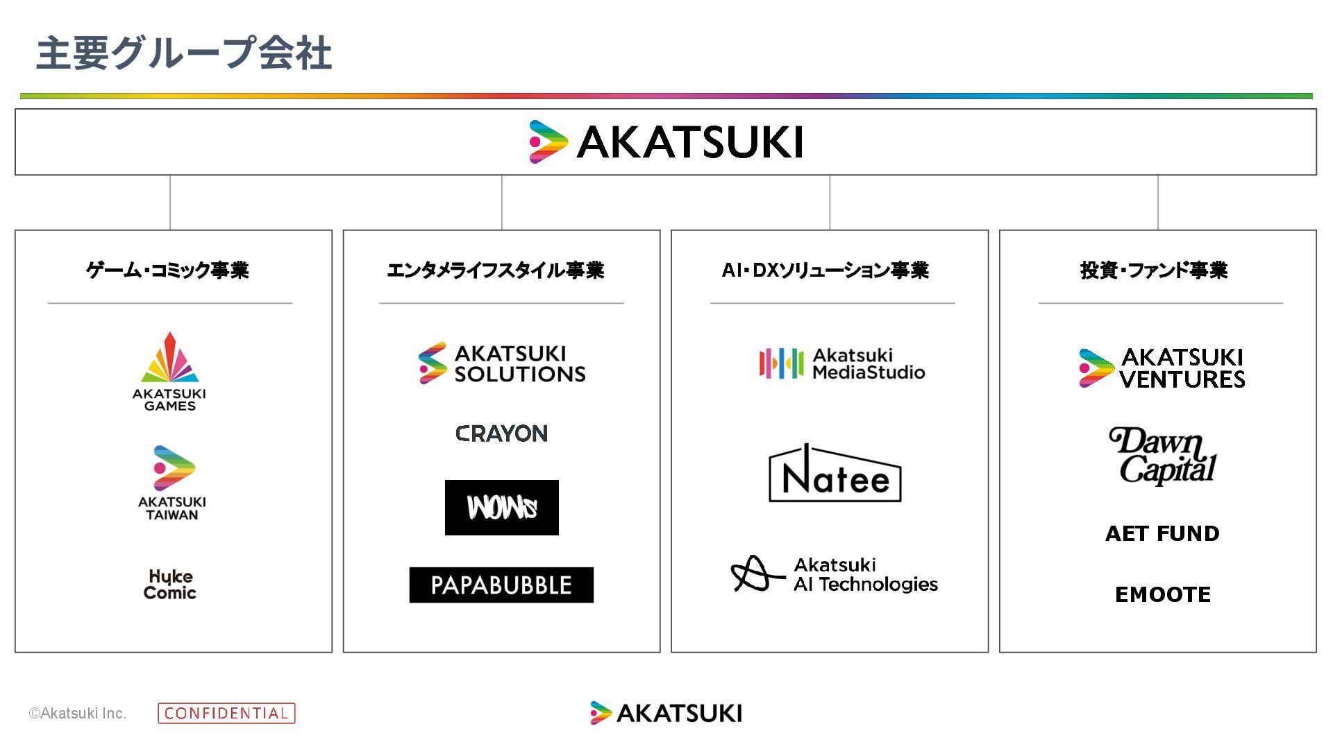 ©Akatsuki Inc. 主要グループ会社 ゲーム・コミック事業 エンタメライフスタイル事業 AI・DXソリューション事業 投資・ファンド事業 AET FUND EMOOTE