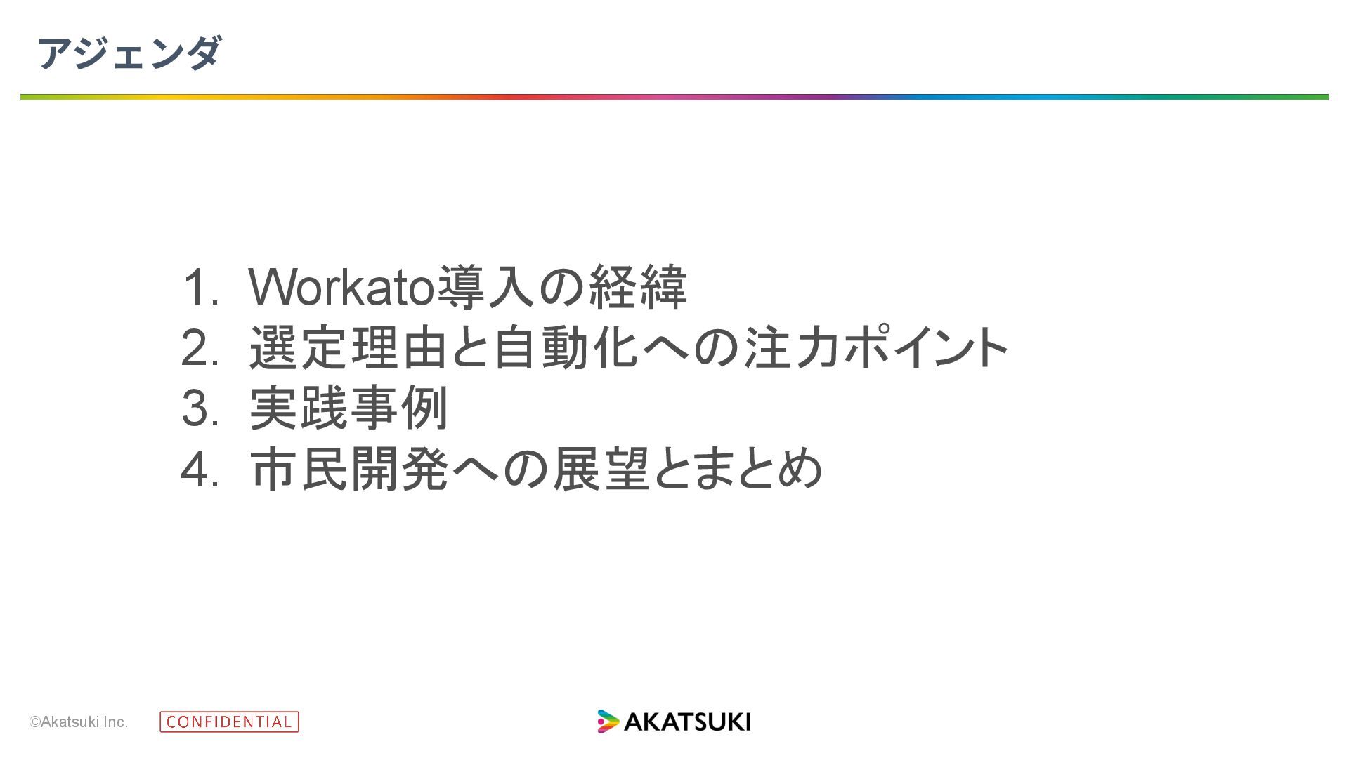 ©Akatsuki Inc. アジェンダ 1. Workato導入の経緯 2. 選定理由と自動化への注力ポイント 3. 実践事例 4.