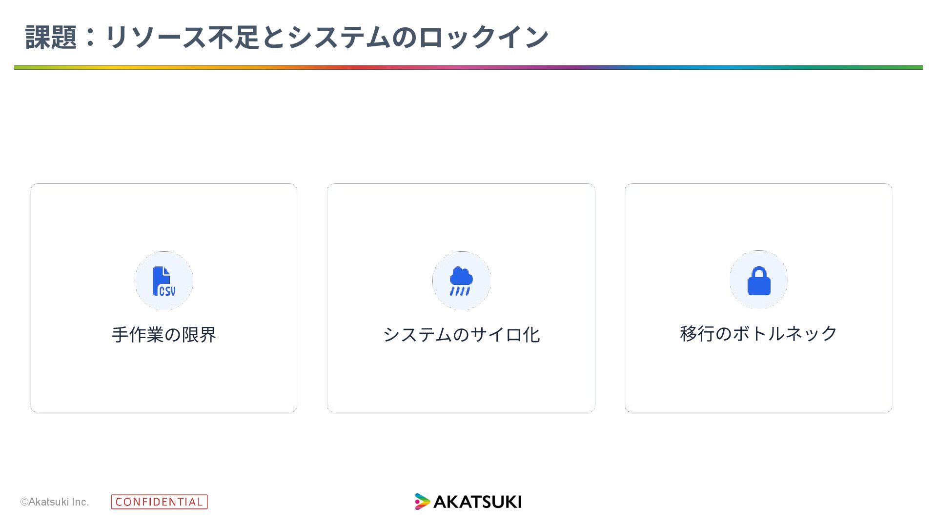 ©Akatsuki Inc. システムのサイロ化 ⼿作業の限界 移⾏のボトルネック 課題:リソース不⾜とシステムのロックイン