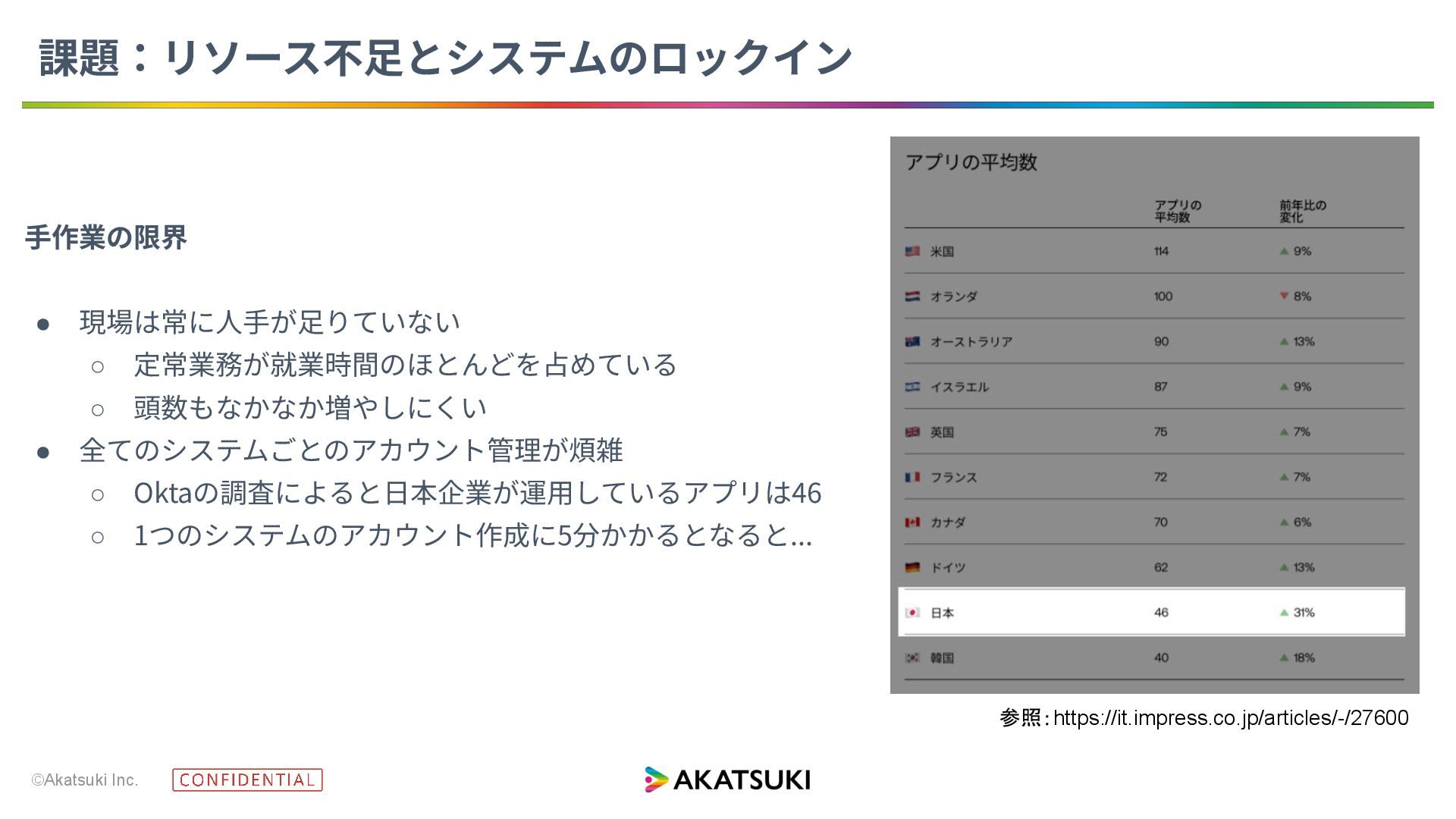 • 全てのシステムごとのアカウント管理が煩雑 ◦ Oktaの調査によると⽇本企業が運⽤しているアプリは46 ◦ 1つのシステムのアカウント作成に5分かかるとなると... 参照:https://it.impress.co.jp/articles/-/27600