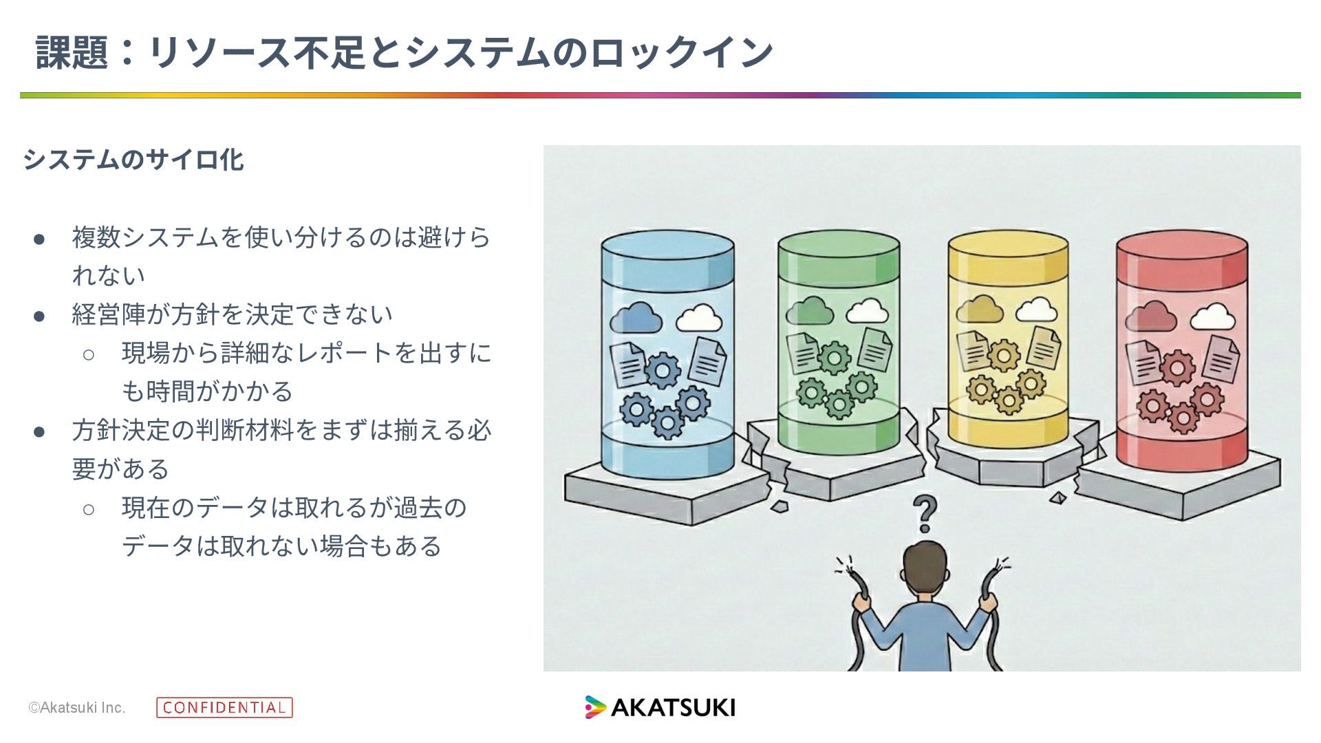 ©Akatsuki Inc. 課題:リソース不⾜とシステムのロックイン システムのサイロ化 • 複数システムを使い分けるのは避けら れない • 経営陣が⽅針を決定できない ◦