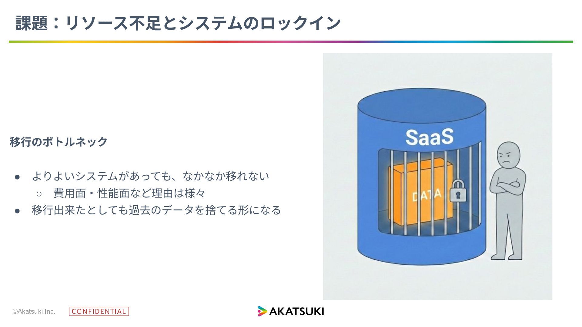 ©Akatsuki Inc. 課題:リソース不⾜とシステムのロックイン 移⾏のボトルネック • よりよいシステムがあっても、なかなか移れない ◦ 費⽤⾯‧性能⾯など理由は様々 • 移⾏出来たとしても過去のデータを捨てる形になる