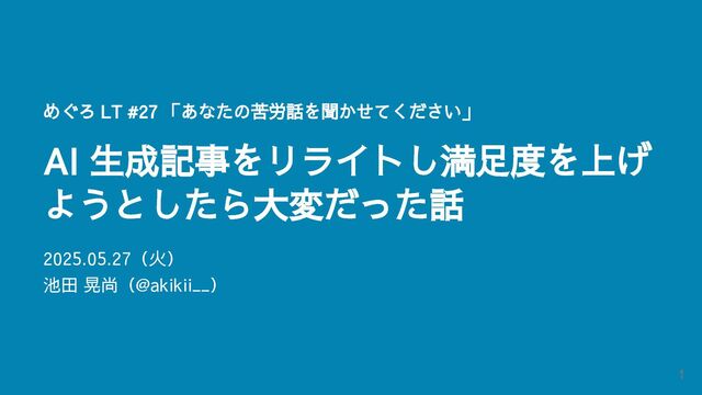 めぐろ LT #27 「あなたの苦労話を聞かせてください」 AI 生成記事をリライトし満足度を上げ ようとしたら大変だった話 2025.05.27(火) 池田 晃尚(@akikii__)