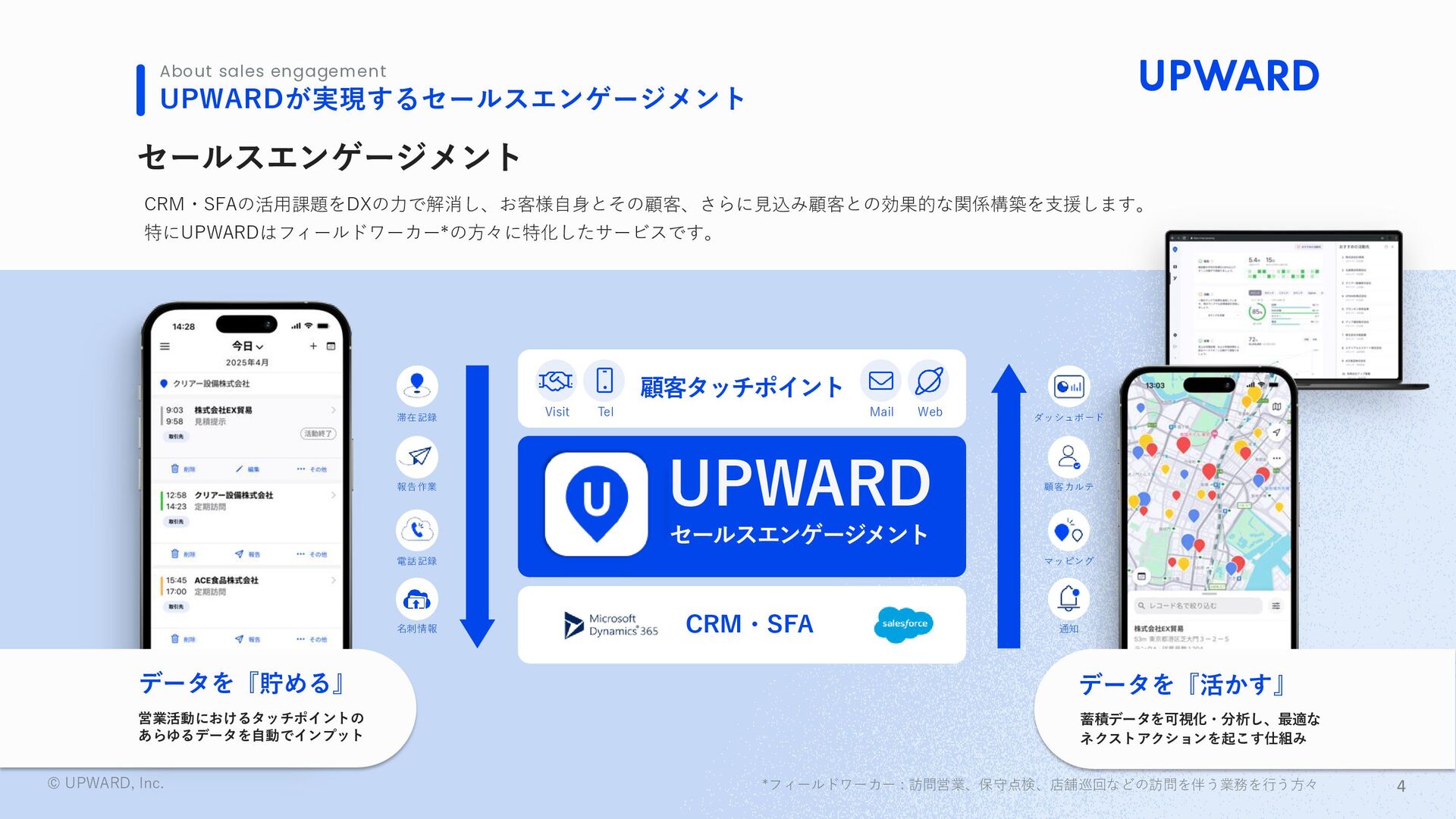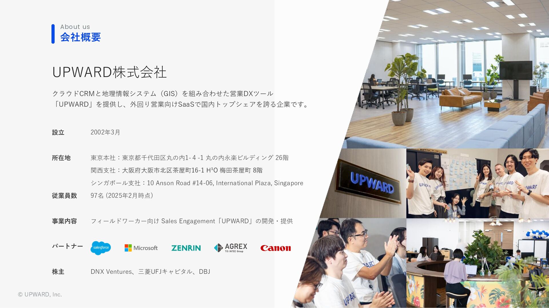 所在地 従業員数 事業内容 パートナー 株主 2002年3月 東京本社:東京都千代田区丸の内1-4-1 丸の内永楽ビルディング 26階 関西支社:大阪府大阪市北区茶屋町16-1 H¹O 梅田茶屋町 8階 シンガポール支社:10 Anson Road #14-06, International Plaza, Singapore 97名 (2025年2月時点) フィールドワーカー向け Sales Engagement「UPWARD」の開発・提供 DNX Ventures、三菱UFJキャピタル、DBJ UPWARD株式会社