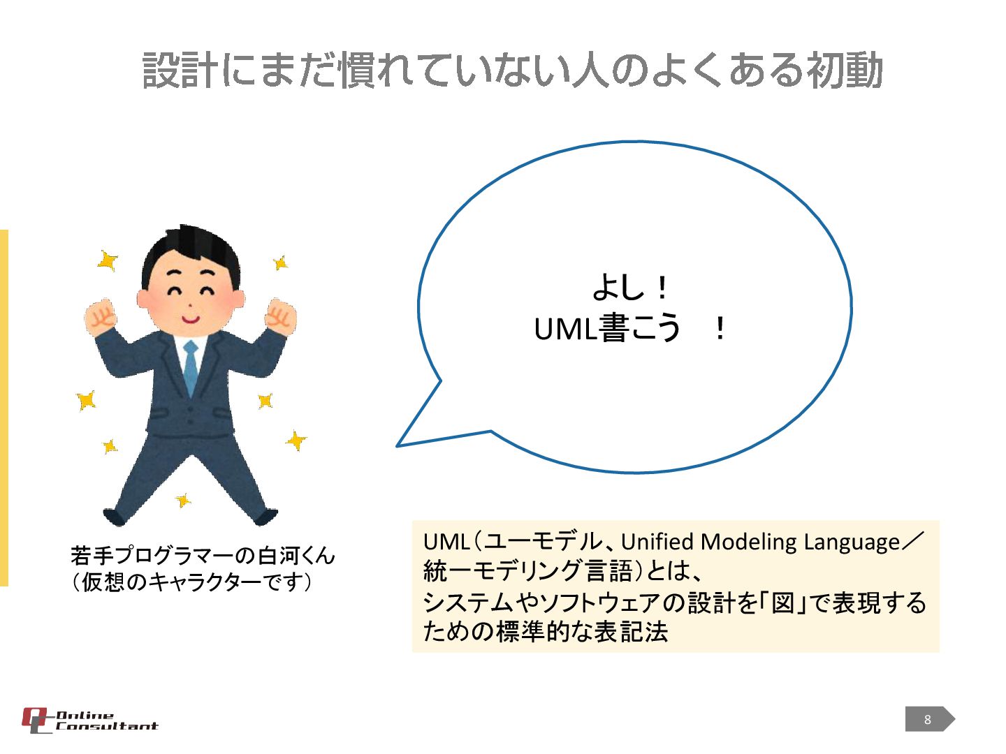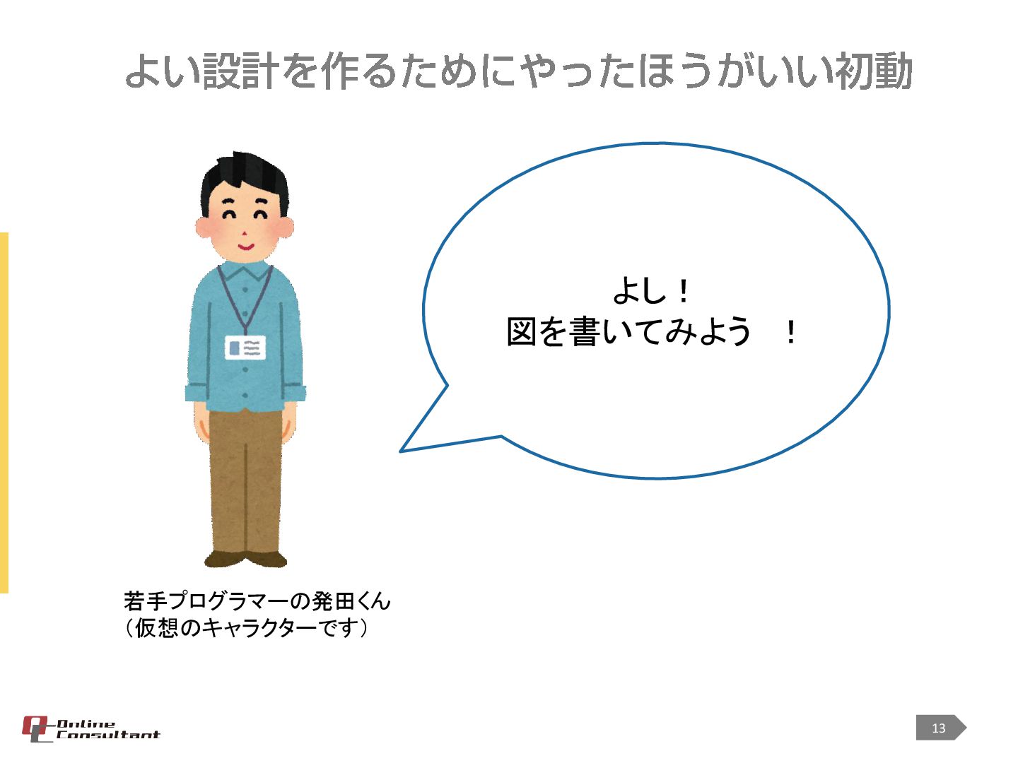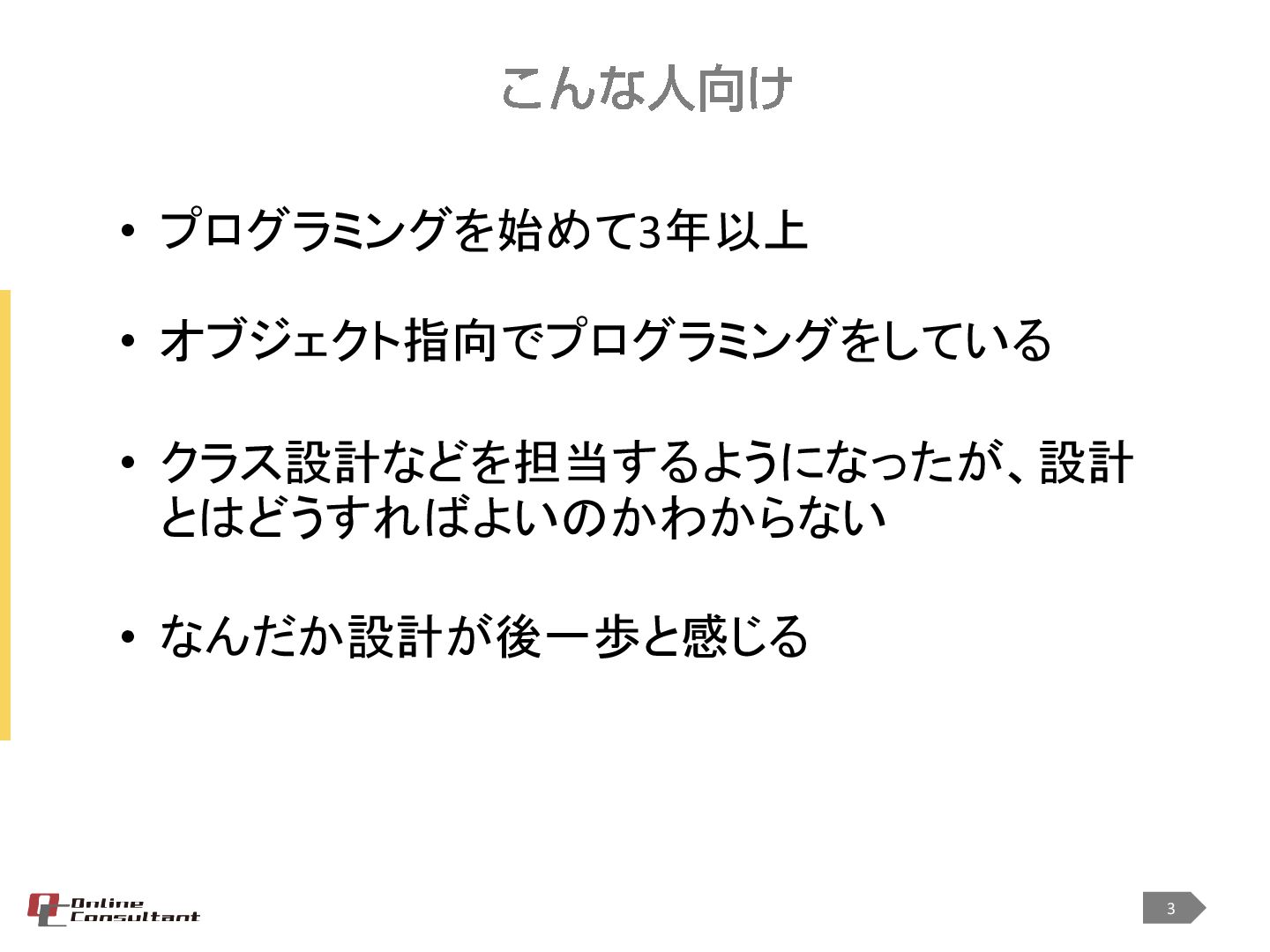 <対象> ・プログラミングを始めて3年以上 ・オブジェクト指向でプログラミングをしている ・クラス設計などを担当するようになったが、設計とはどうすればよいのかわからない ・なんだか設計が後一歩と感じる