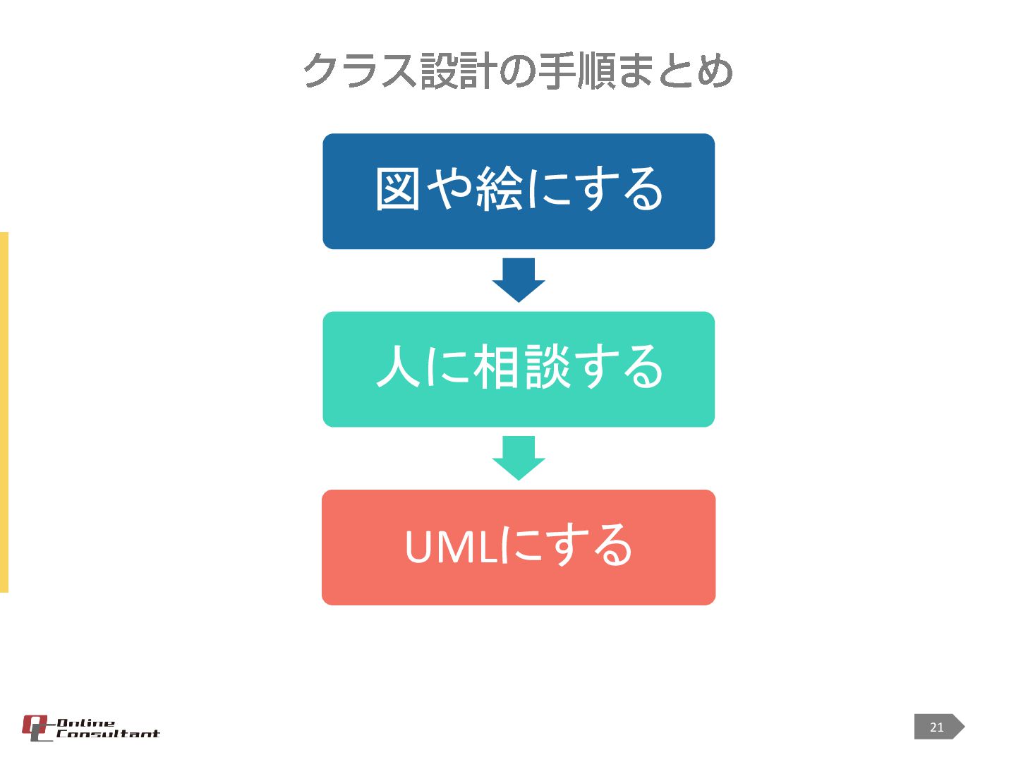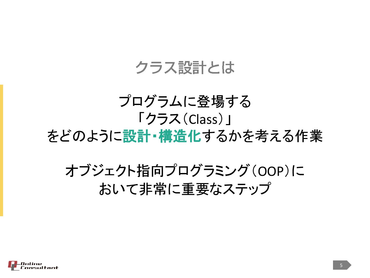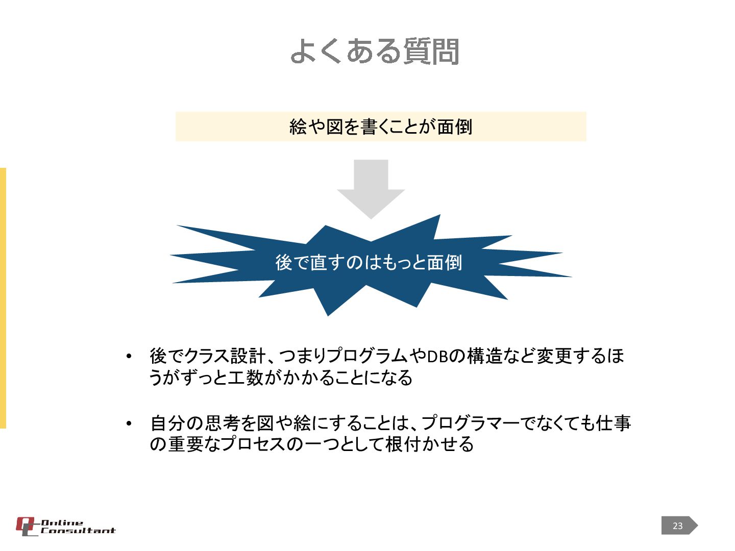 <対象> ・プログラミングを始めて3年以上 ・オブジェクト指向でプログラミングをしている ・クラス設計などを担当するようになったが、設計とはどうすればよいのかわからない ・なんだか設計が後一歩と感じる