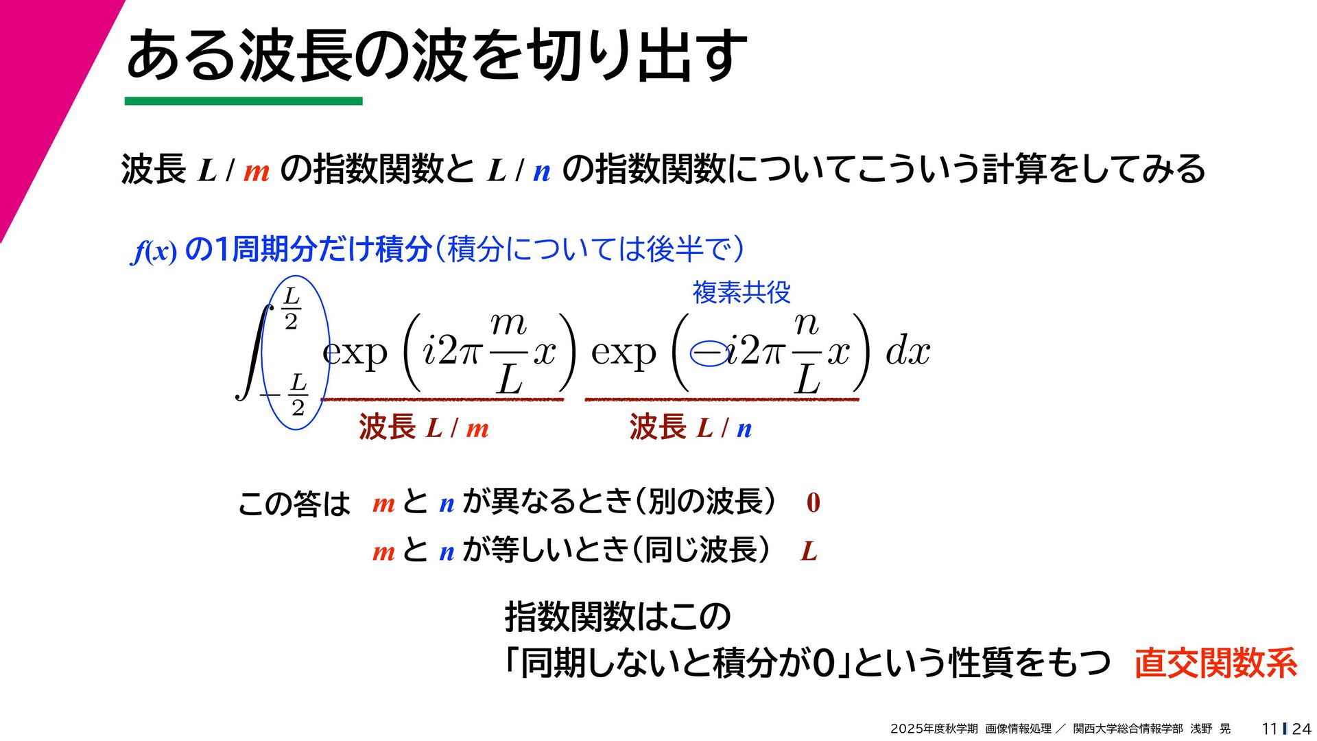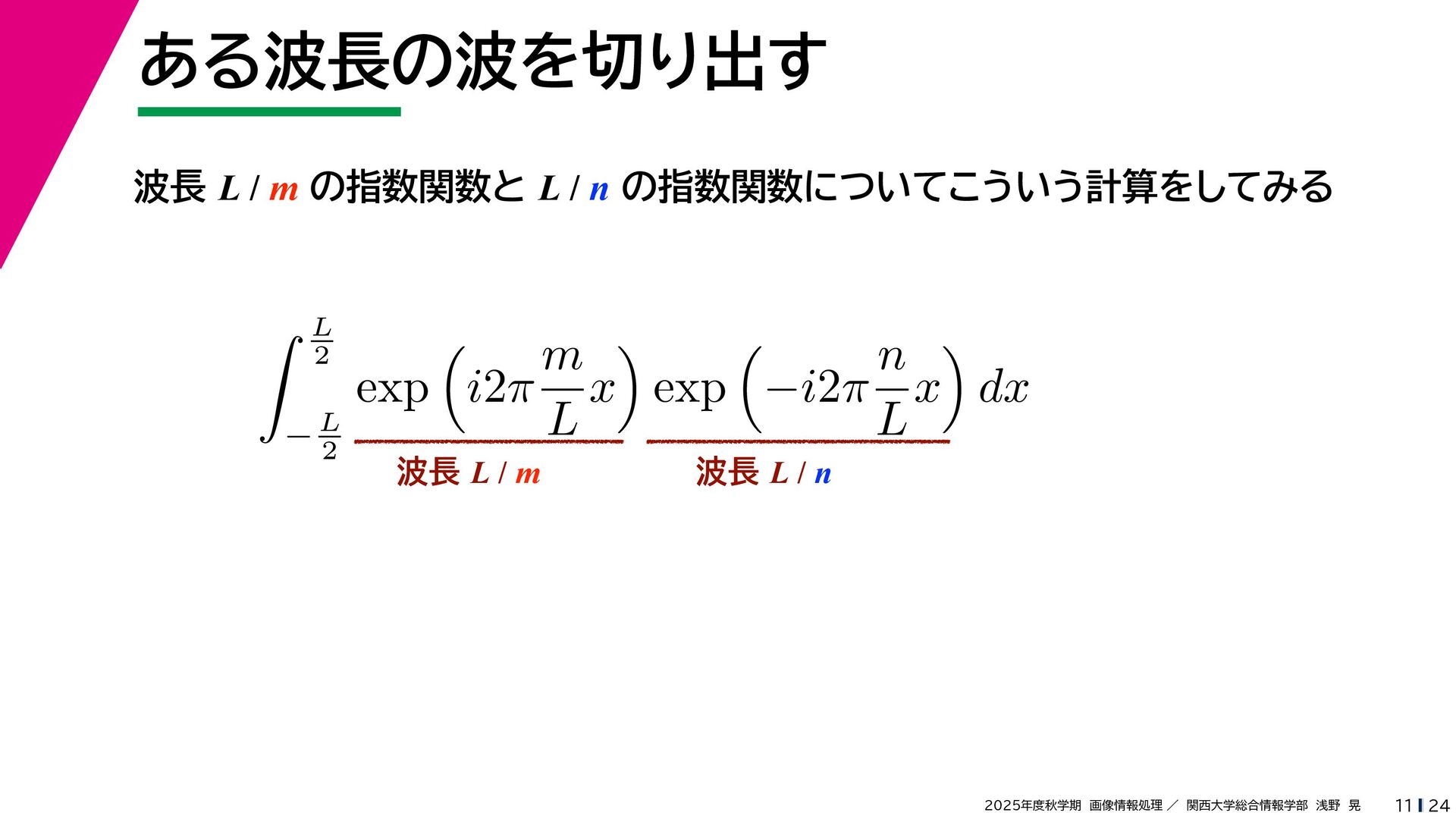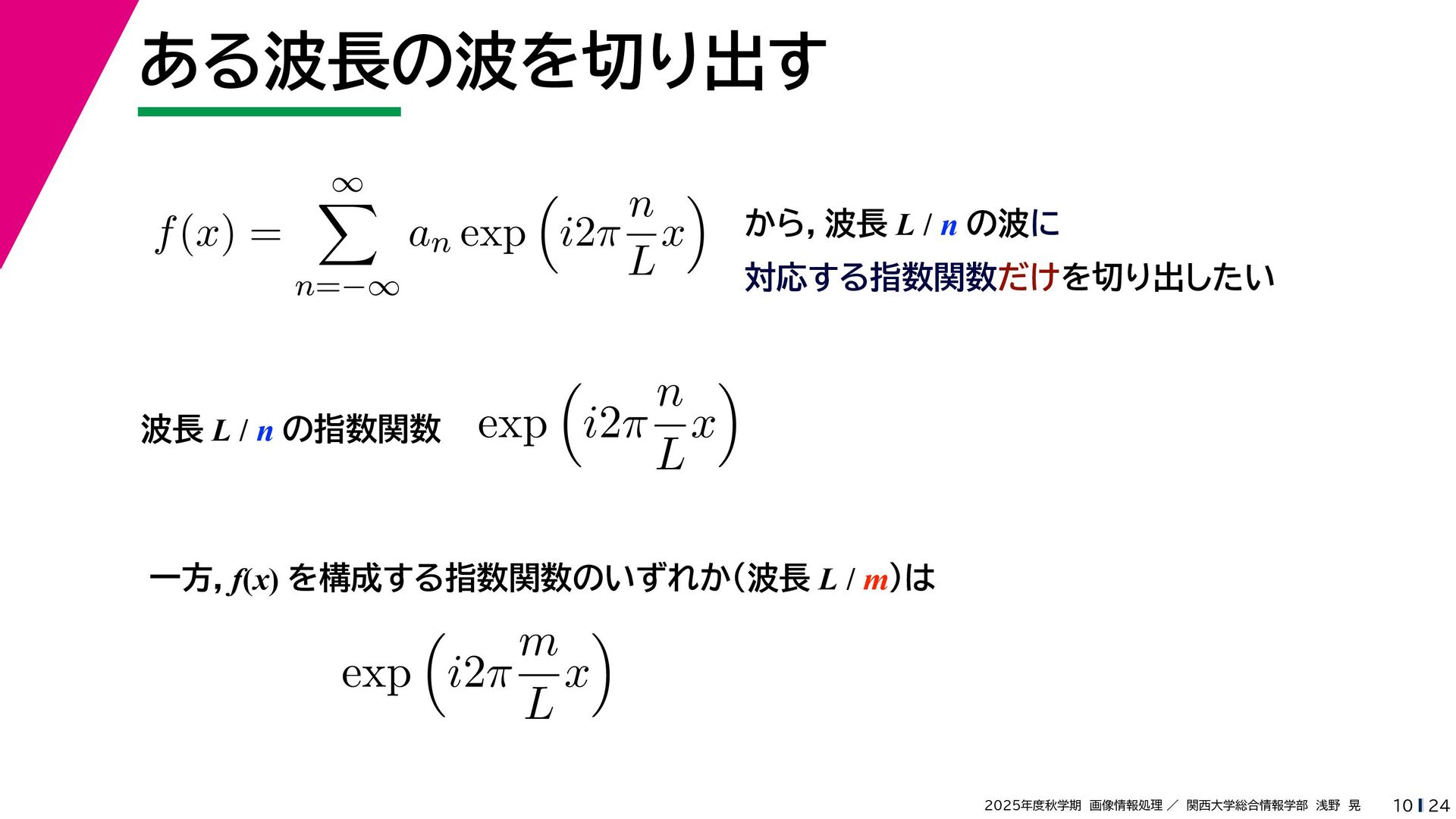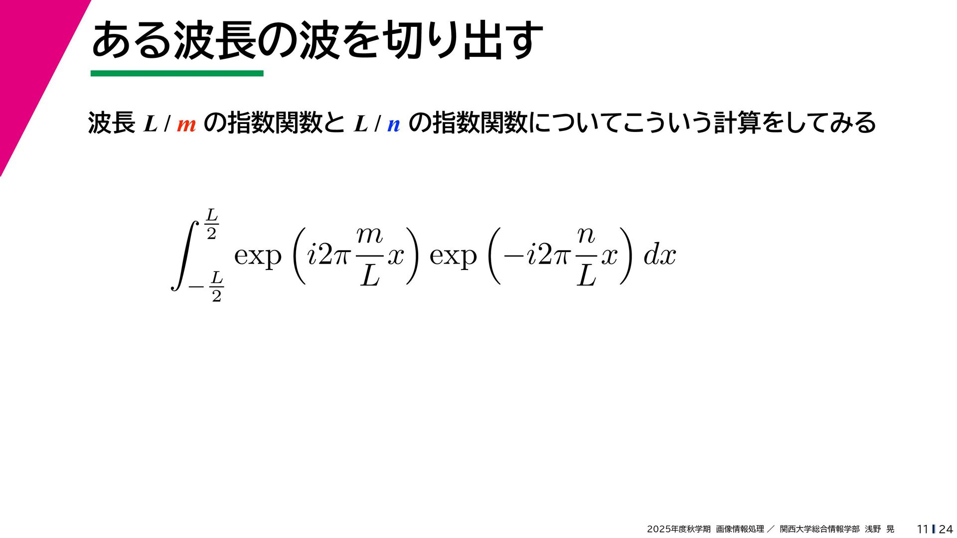 6. 24 2025年度秋学期 画像情報処理 / 関西大学総合情報学部 浅野 晃 ある波長の波を切り出す 10 一方,f(x) を構成する指数関数のいずれか(波長 L / m)は