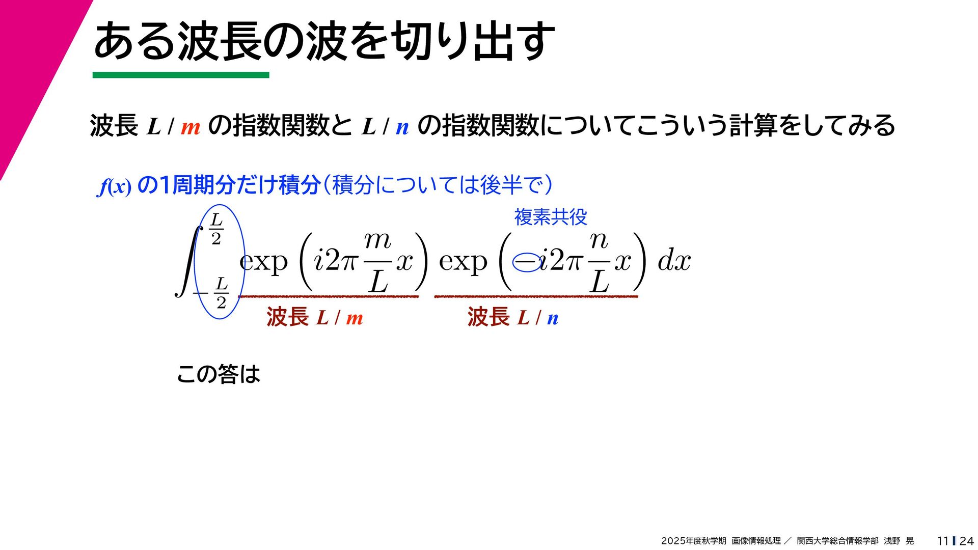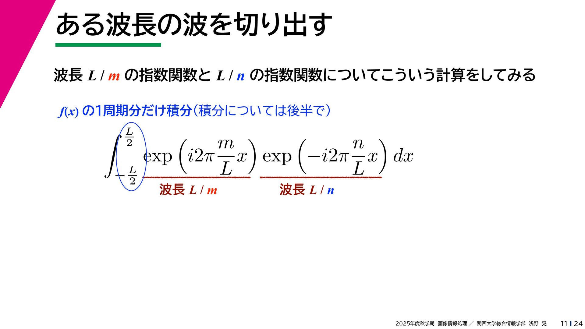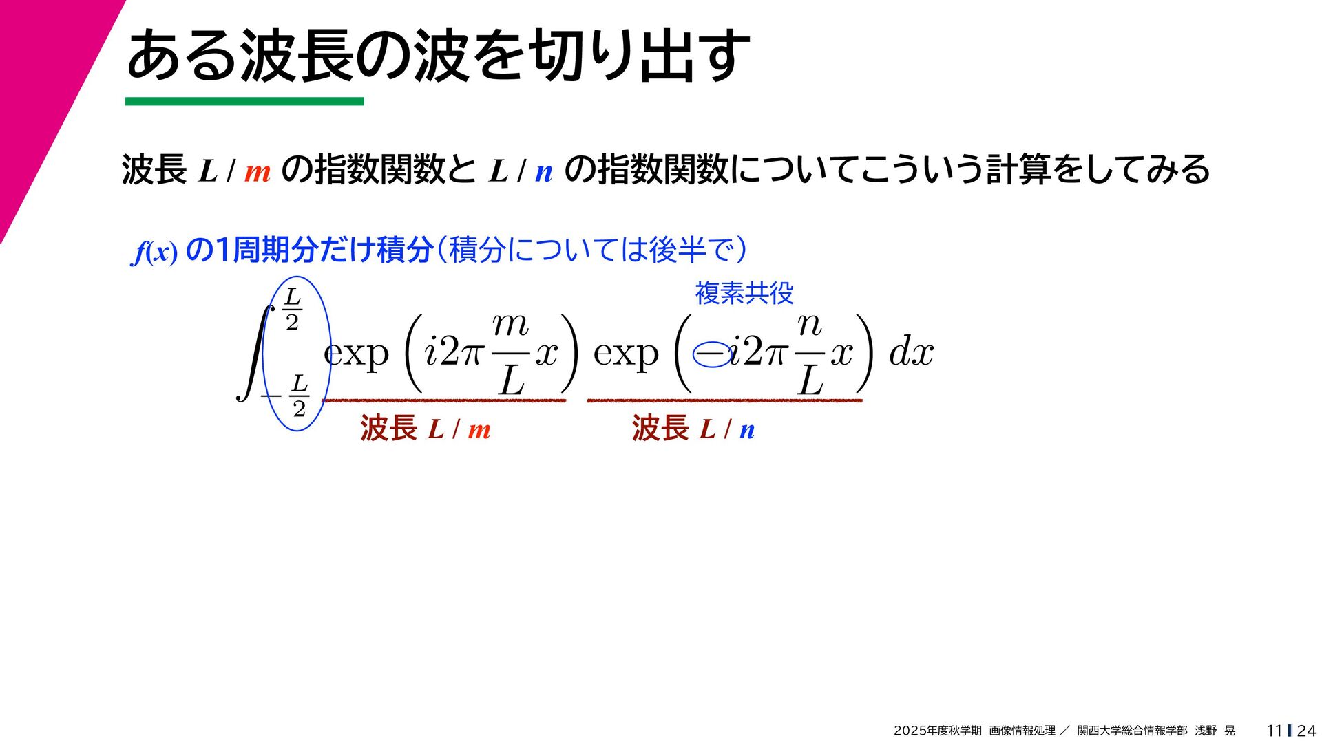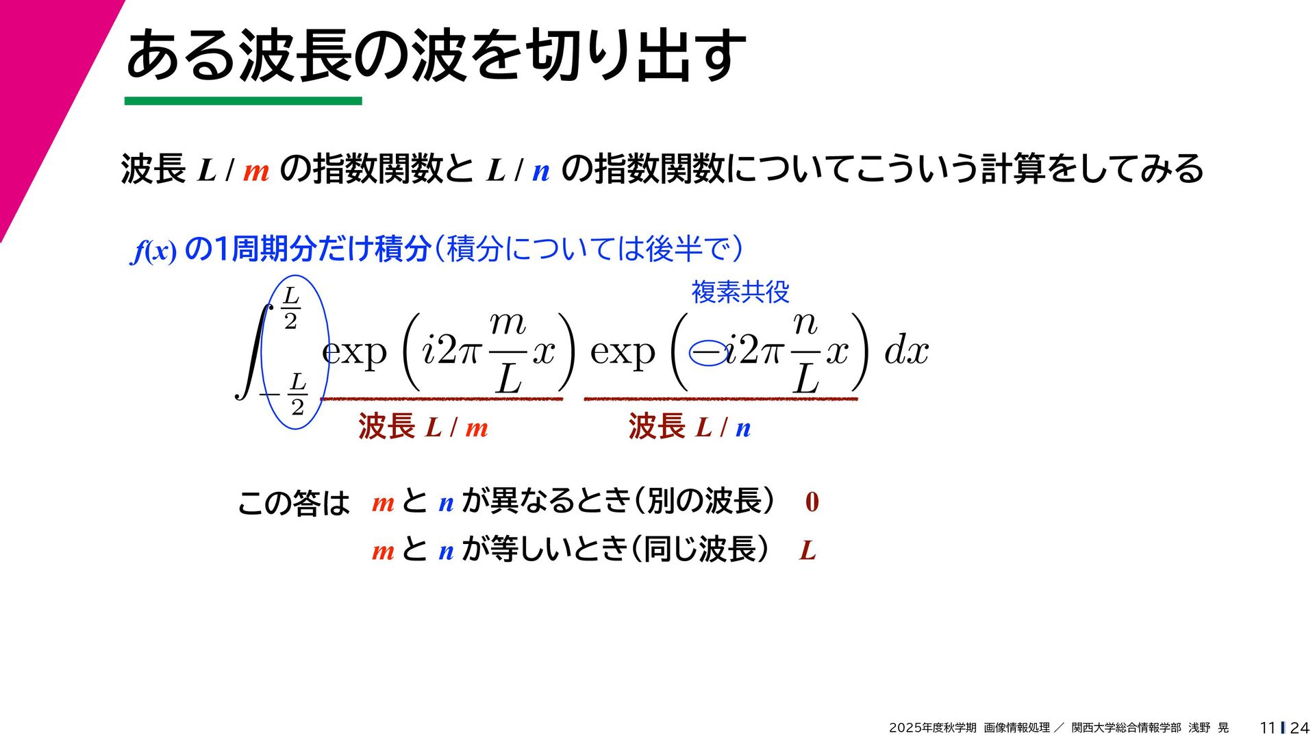 6. 24 2025年度秋学期 画像情報処理 / 関西大学総合情報学部 浅野 晃 ある波長の波を切り出す 10 一方,f(x) を構成する指数関数のいずれか(波長 L / m)は
