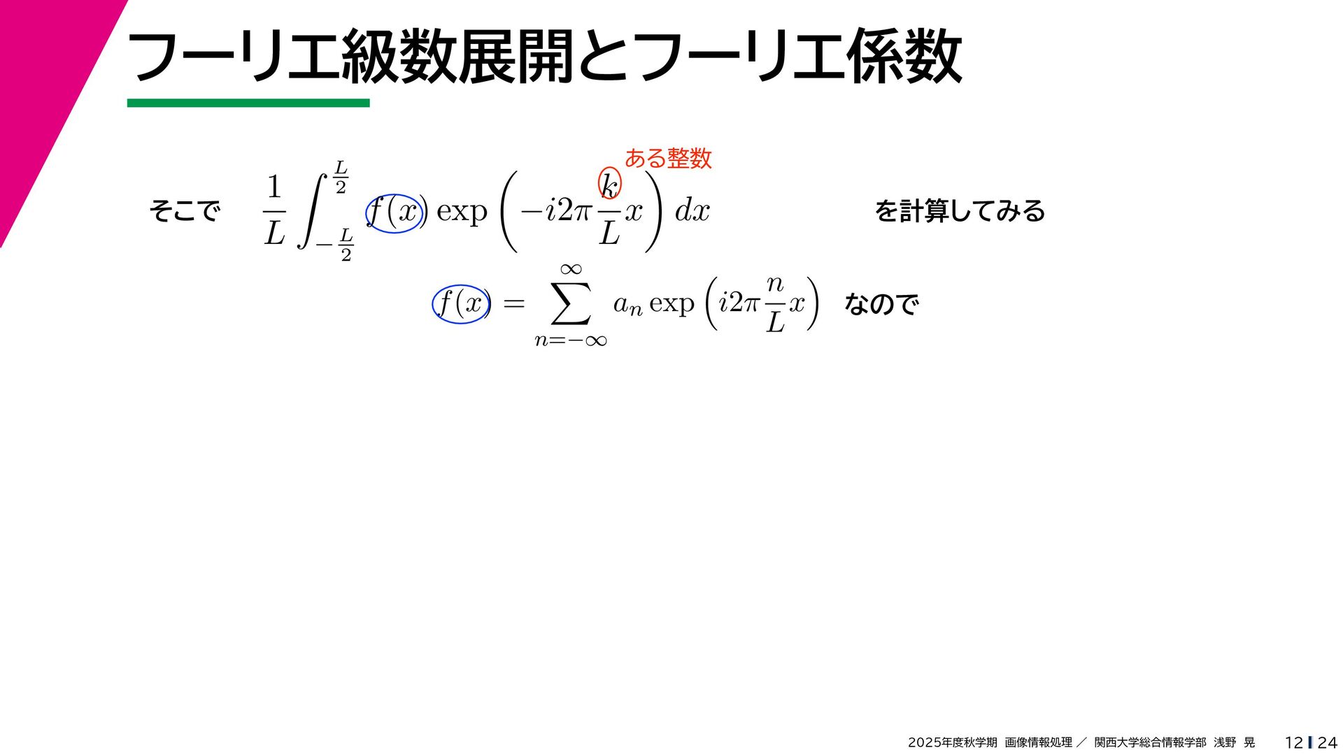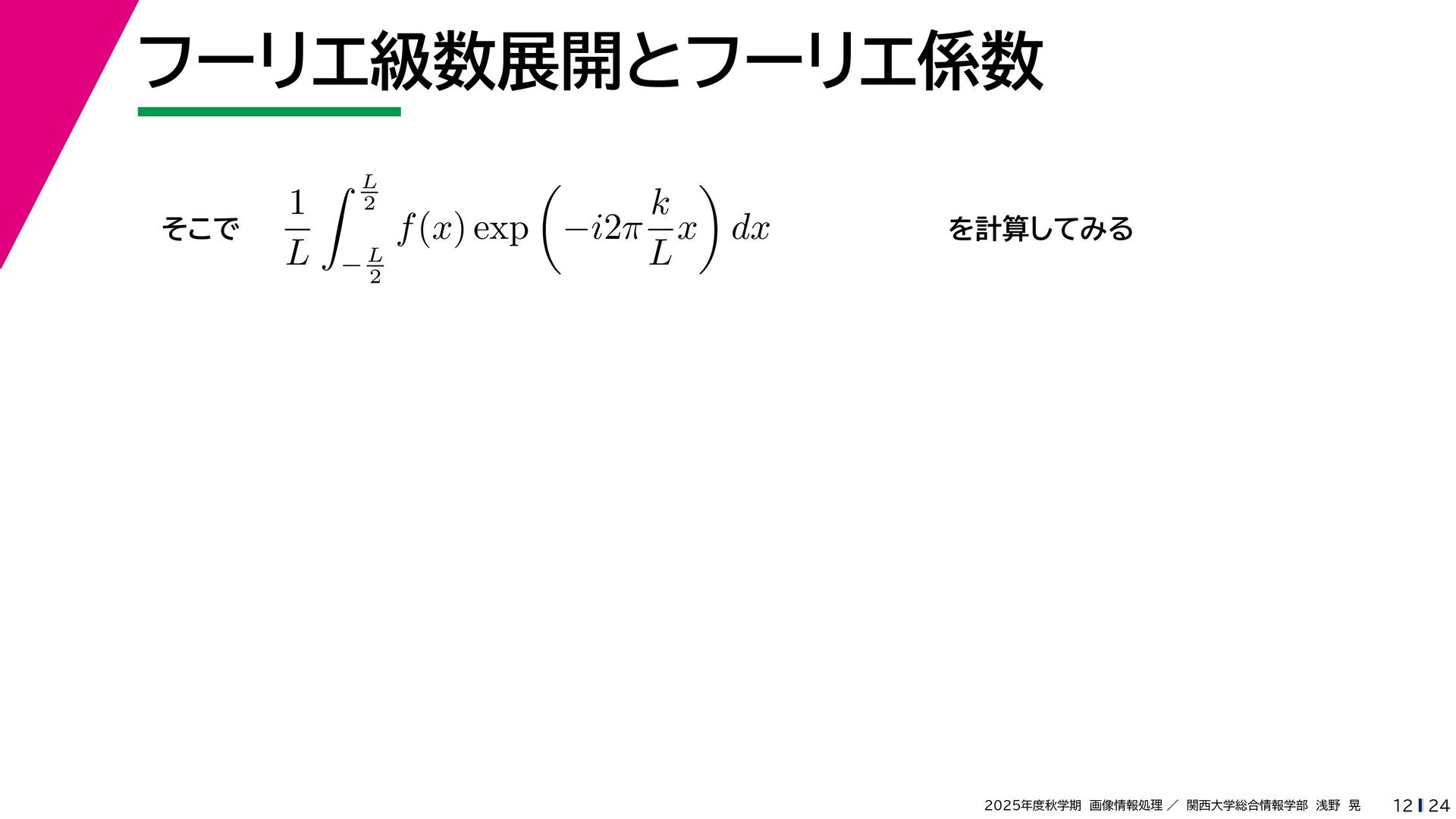 14. 24 2025年度秋学期 画像情報処理 / 関西大学総合情報学部 浅野 晃 フーリエ級数展開とフーリエ係数 12 そこで 1 L L 2